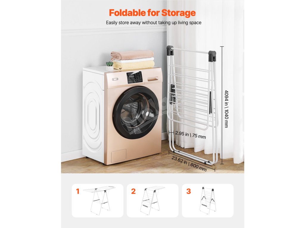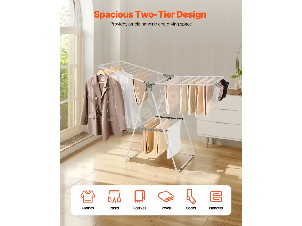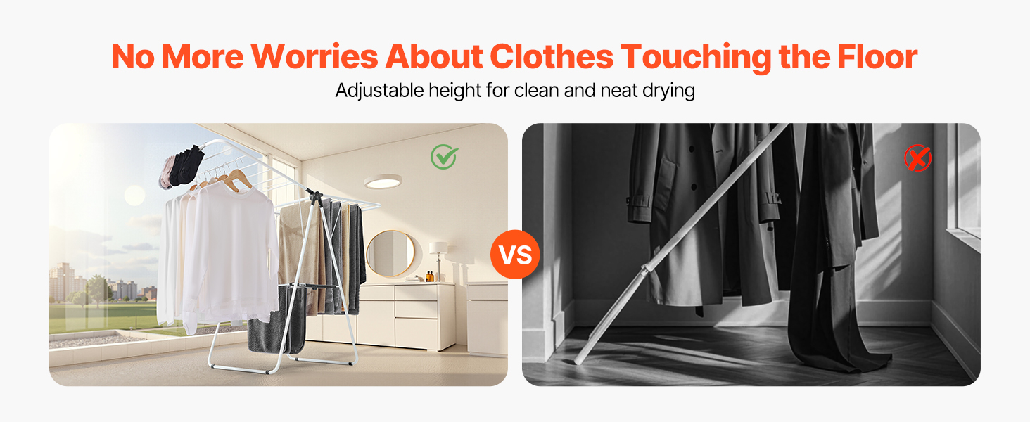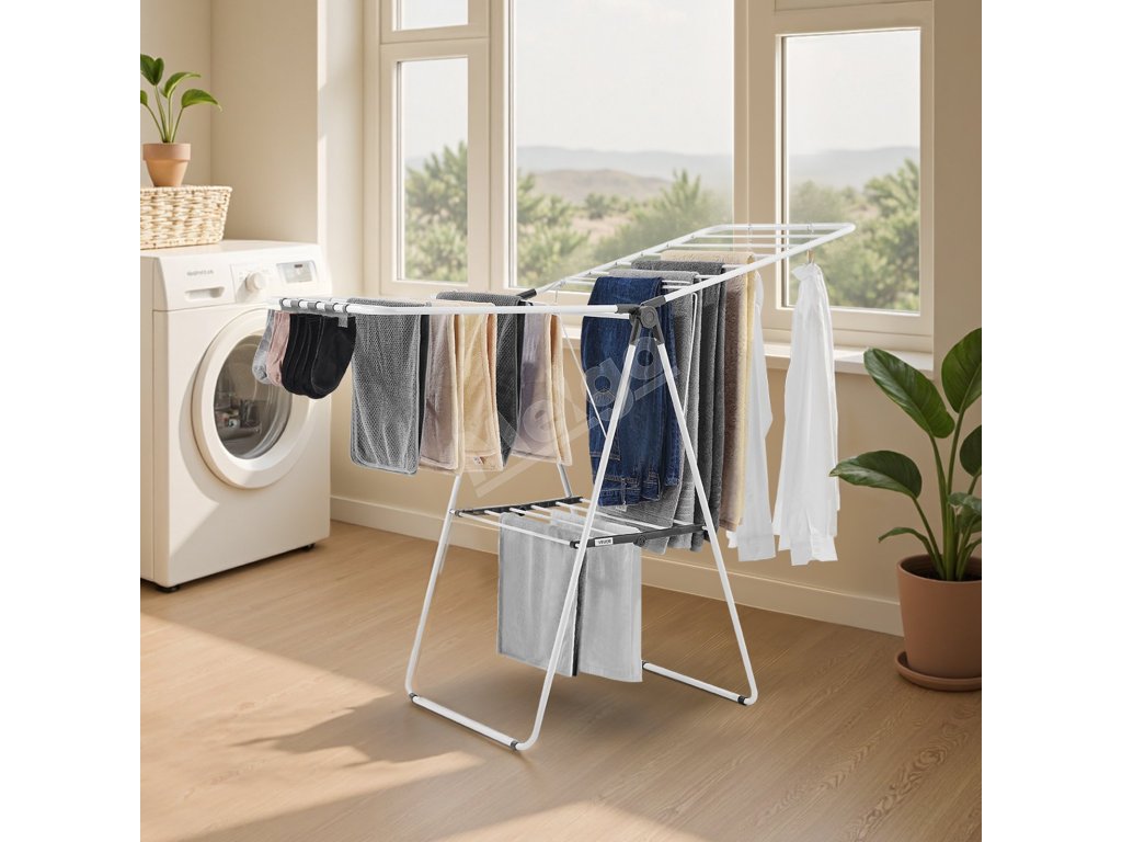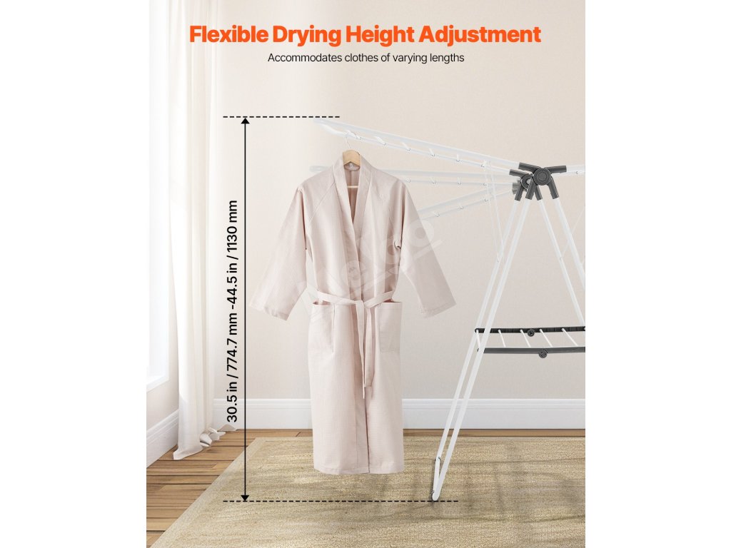 Výška je nastaviteľná (44,5 palca / 113 cm), takže je ideálny na sušenie rôznych predmetov, ako sú šaty, košele a prestieradlá. Udržuje oblečenie mimo podlahy, čím zabezpečuje, že zostane suché a čisté.