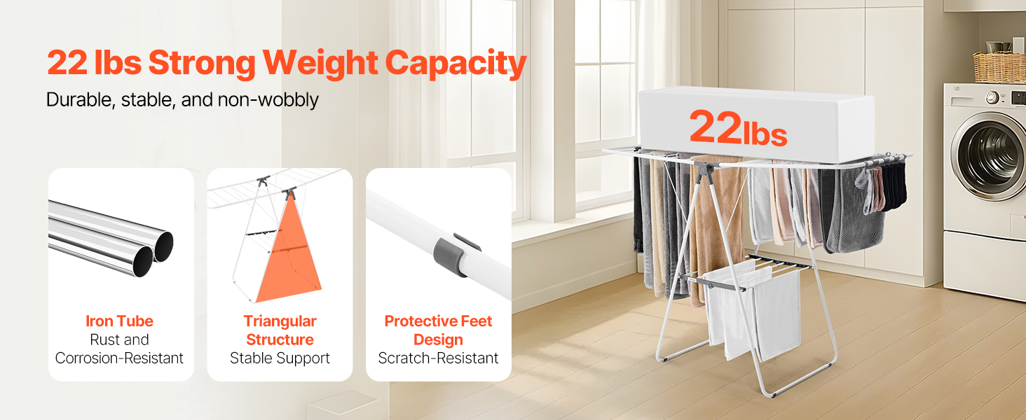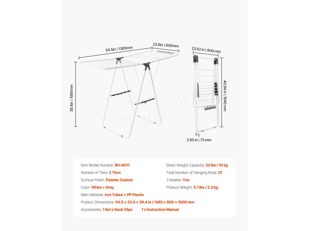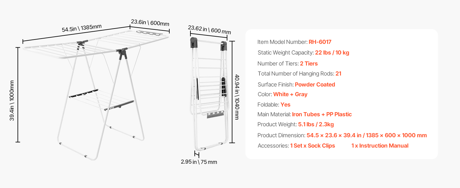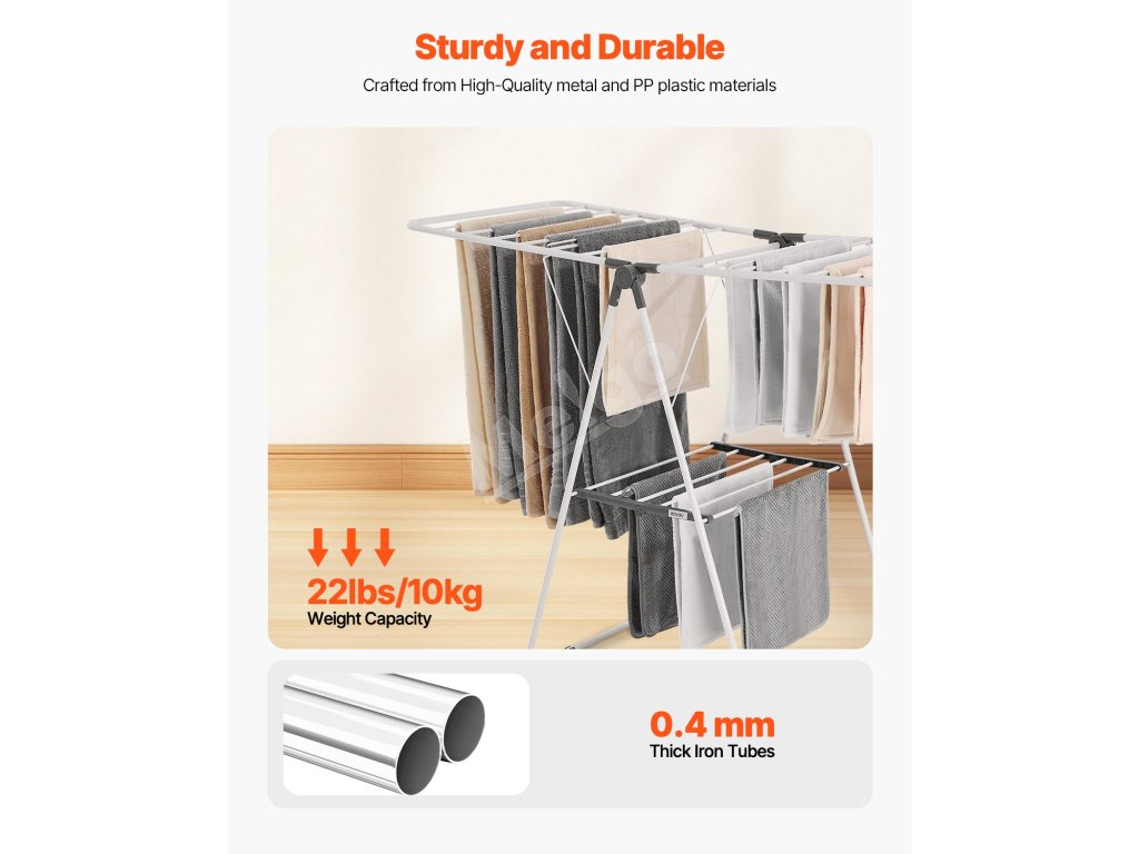 Je vyrobený zo železa a PP plastu, odolný proti korózii a korózii, unesie až 22 libier / 10 kg. Nastaviteľná výška (44,5 palca / 113 cm) sa prispôsobí oblečeniu rôznej dĺžky. Obsahuje špeciálne klipy na ponožky, ktoré zabraňujú pádom, a ľahko sa skladá na úsporu miesta pri skladovaní.