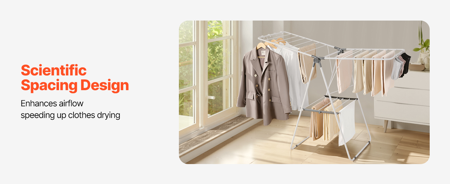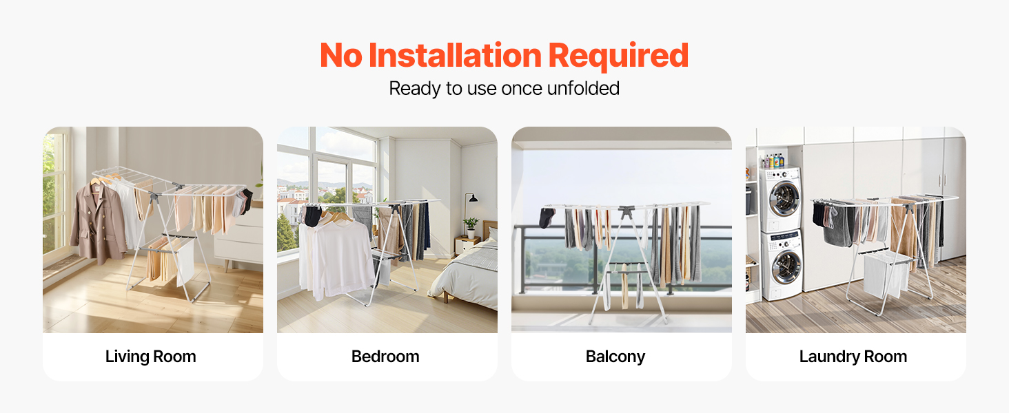 Rýchloskladací dizajn nevyžaduje žiadnu montáž - stačí rozložiť a používať. Či už v obývačke, spálni, na balkóne alebo v práčovni, je ľahko umiestniteľný a kedykoľvek pripravený na použitie.