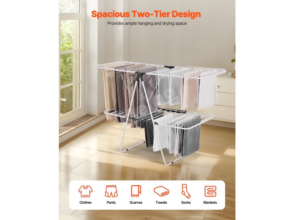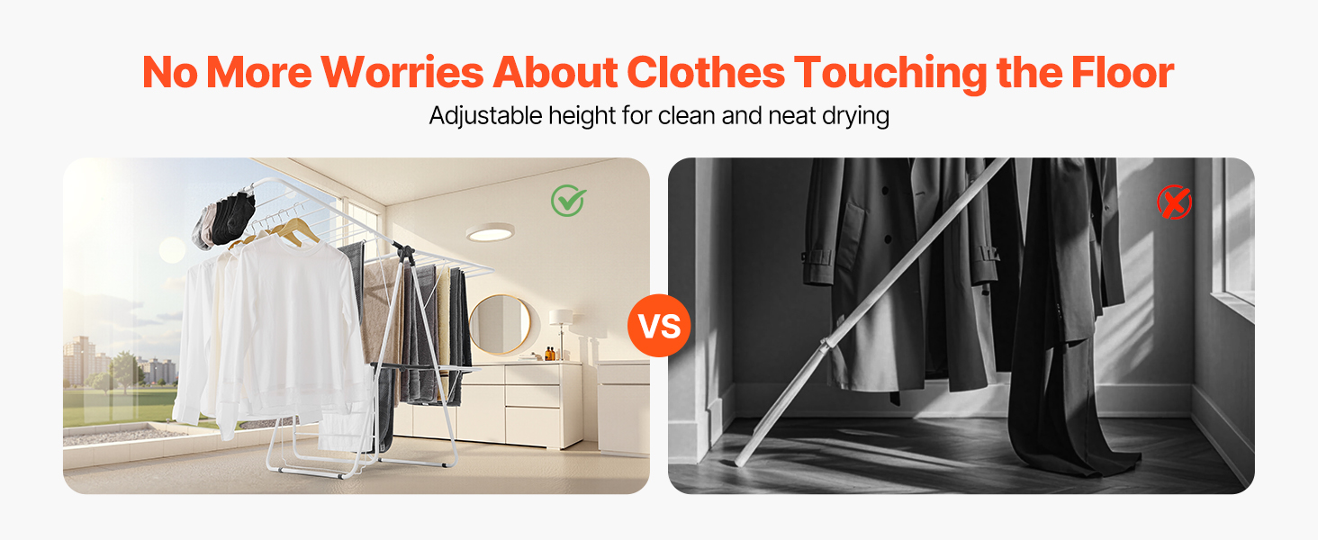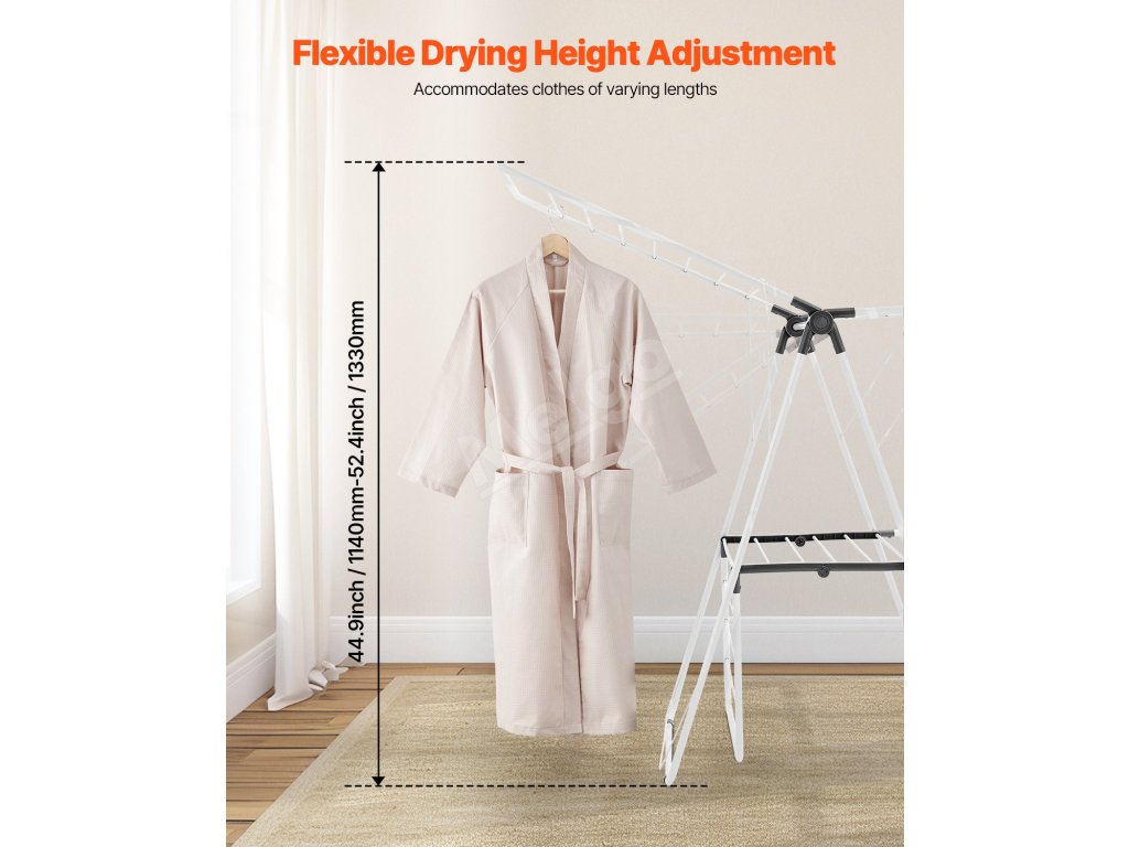 Výška je nastaviteľná (44,5 palca / 113 cm), takže je ideálny na sušenie rôznych predmetov, ako sú šaty, košele a prestieradlá. Udržuje oblečenie mimo podlahy, čím zabezpečuje, že zostane suché a čisté.