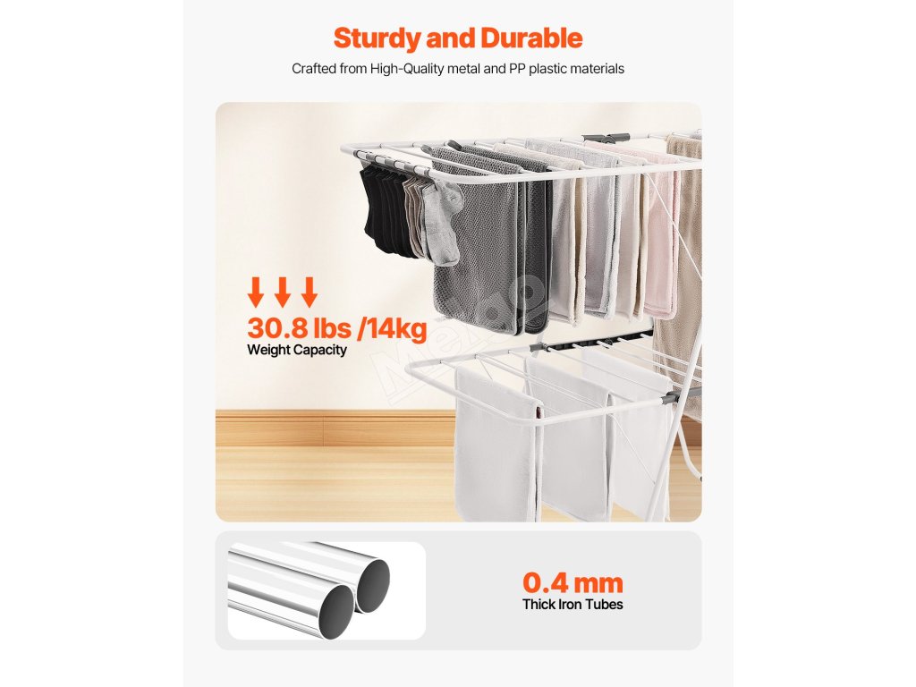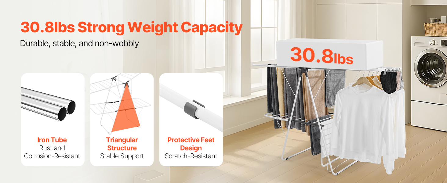 Vďaka pôsobivej nosnosti 30,8 lbs / 14 kg zostáva stabilný a nekolíše sa. Rám zo železných rúrok v spojení s trojuholníkovou konštrukciou zaisťuje pevnú oporu pre bezpečné sušenie. Spodná časť je vybavená ochrannými nožičkami, ktoré zabraňujú poškodeniu podlahy.