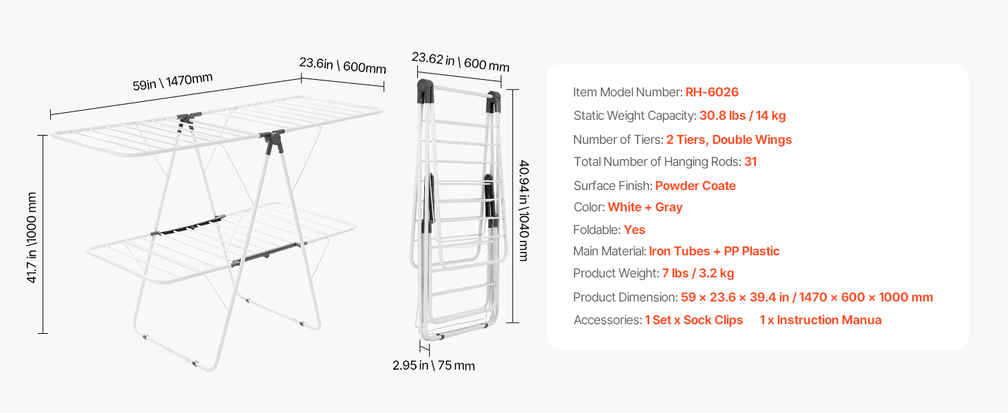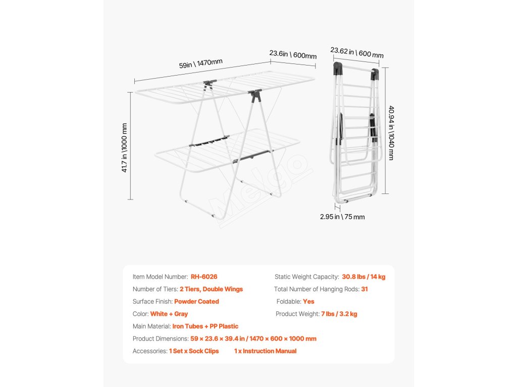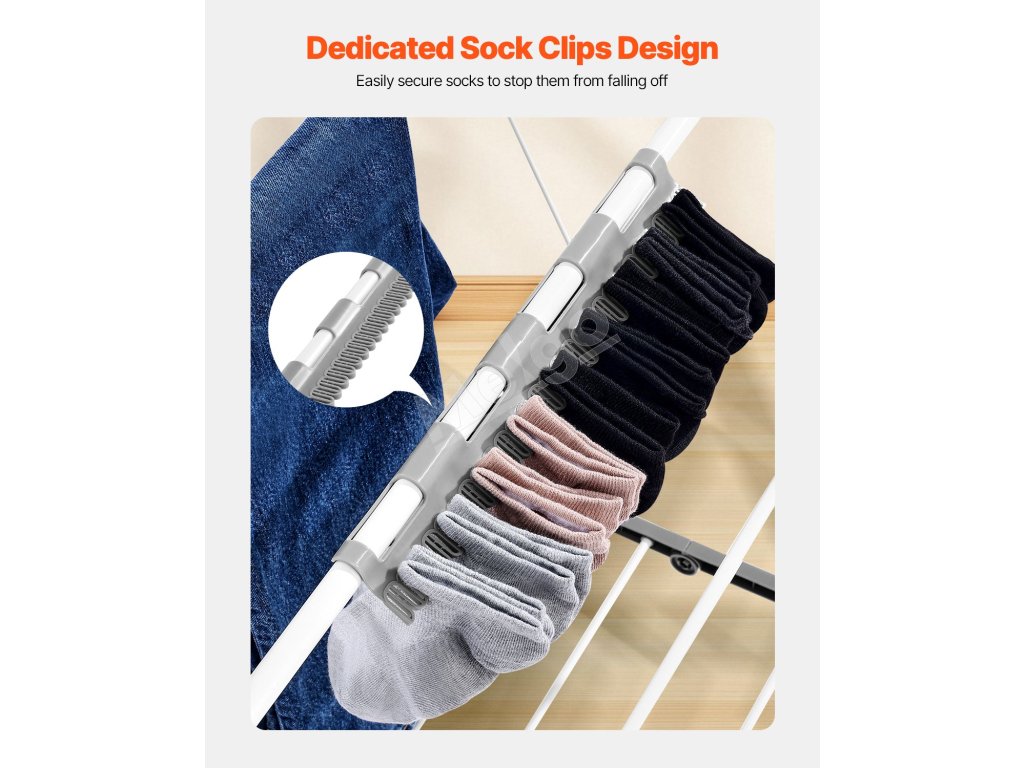 Je vyrobený zo železných rúrok a PP plastu, odolný proti korózii a korózii, s nosnosťou 30,8 lbs / 14 kg. Nastaviteľná výška (44,5 palca / 113 cm) sa prispôsobí oblečeniu rôznej dĺžky. Obsahuje špeciálne klipy na ponožky, ktoré zabraňujú pádu predmetov.