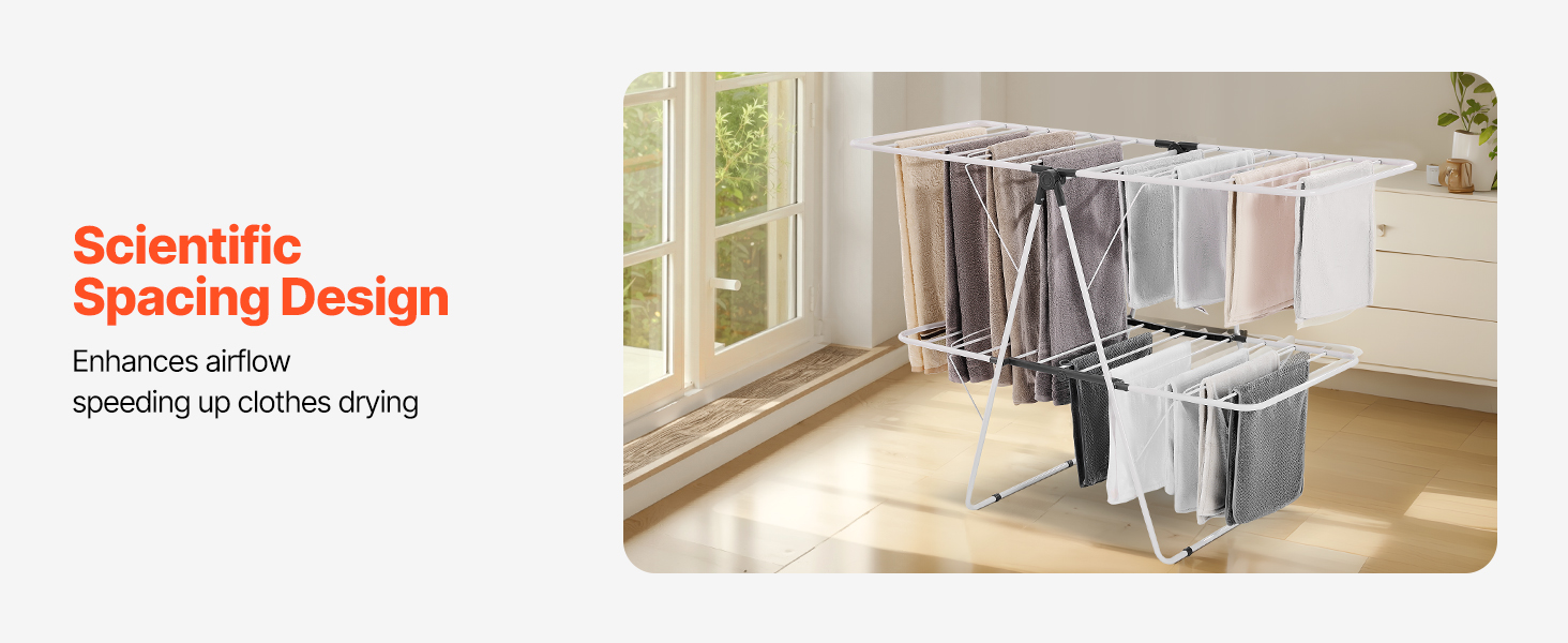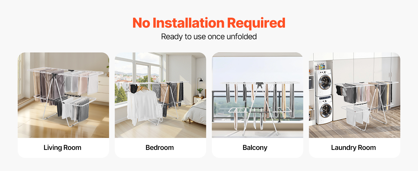 Rýchloskladací dizajn nevyžaduje žiadnu montáž - stačí rozložiť a používať. Či už v obývačke, spálni, na balkóne alebo v práčovni, je ľahko umiestniteľný a kedykoľvek pripravený na použitie.