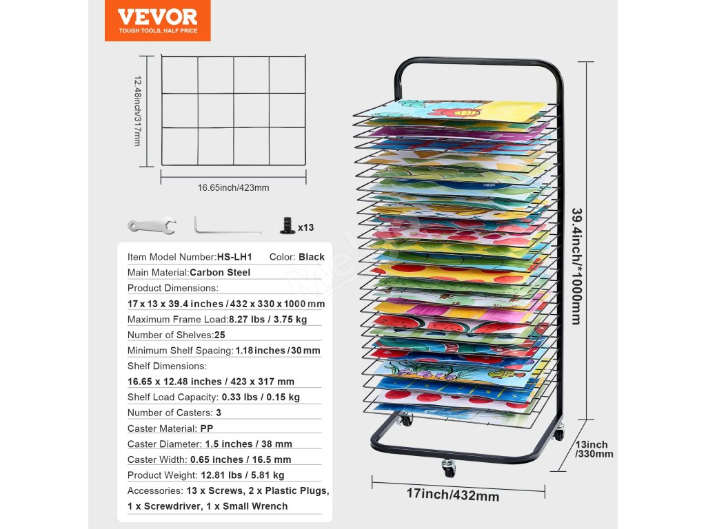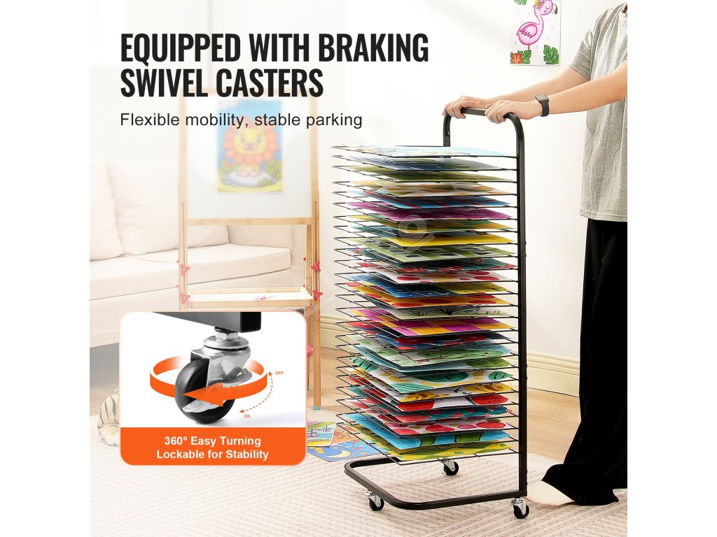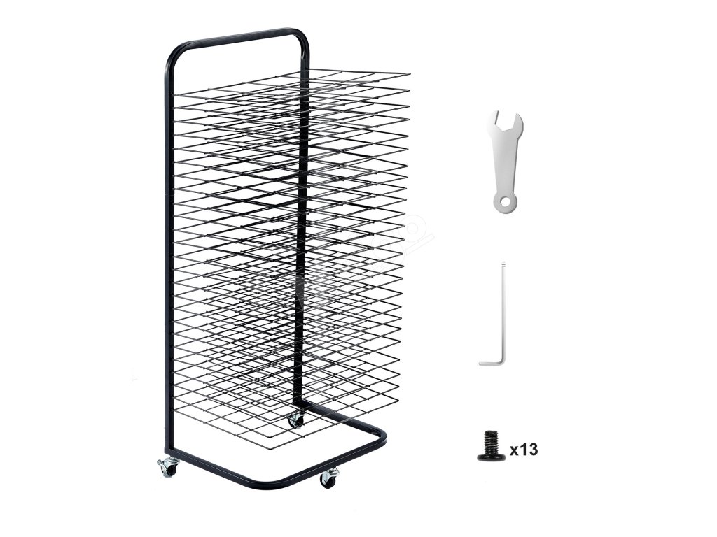 Všetkých 25 políc je nastaviteľných tak, aby vyhovovali rôznym potrebám sušenia, a umožňuje jednoduché vkladanie alebo vyberanie, aby sa zabránilo rozmazaniu mokrých umeleckých diel. Kovová konštrukcia s práškovou povrchovou úpravou zaisťuje hladký každý roh, čím zabraňuje poškriabaniu a zároveň je odolná a estetická.