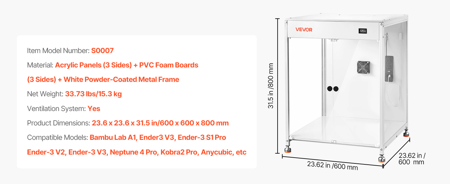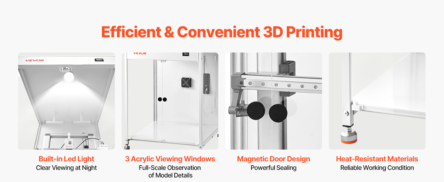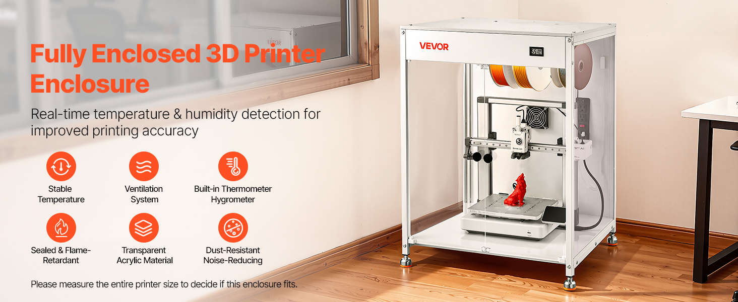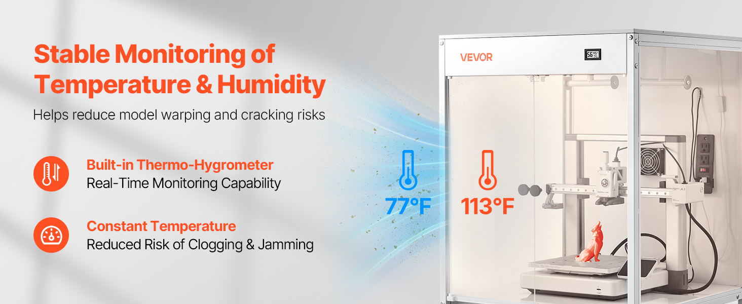Tento kryt pre 3D tlačiarne má úplne uzavretú tlačovú komoru, ktorá udržiava stabilnú teplotu a vlhkosť. Poskytuje teplomer-hygrometer, čím sa znižuje deformácia a praskanie. Spolu s priehľadným oknom znižuje prašnosť a hluk a zabraňuje náhodnému kontaktu.