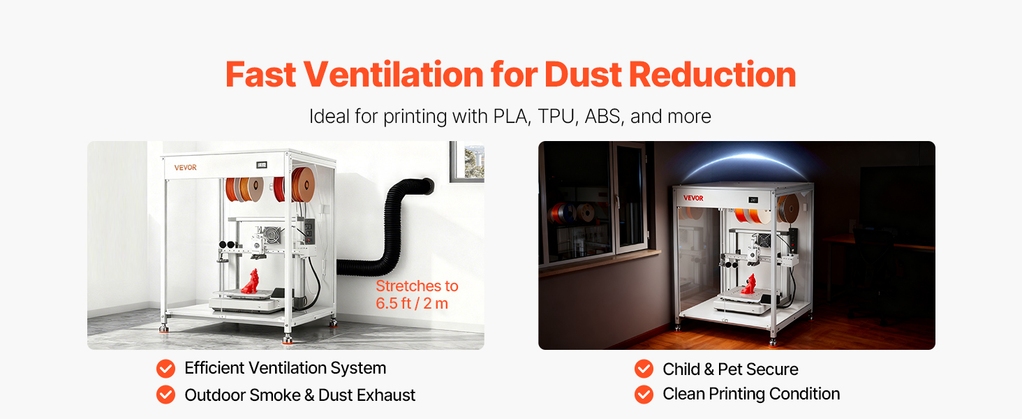 Vďaka prachuvzdornej uzavretej konštrukcii s ventilačným systémom dokáže kryt tlačiarne vyhnať dym a prach, čím sa udržiava čistý stav. Je ideálny pre vlákna PLA, TPU a ABS a zároveň chráni deti alebo domáce zvieratá pred časťami s vysokou teplotou, čím zvyšuje bezpečnosť.