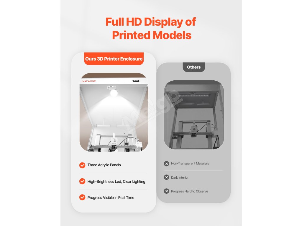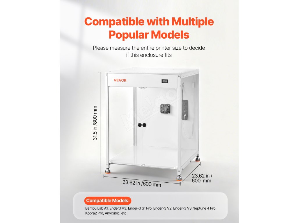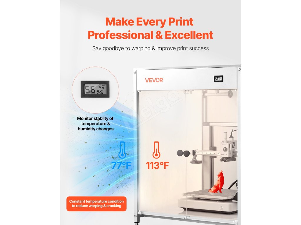 Tento kryt pre 3D tlačiarne má úplne uzavretú tlačovú komoru, ktorá udržiava stabilnú teplotu a vlhkosť. Poskytuje teplomer-hygrometer, čím sa znižuje deformácia a praskanie. Spolu s priehľadným oknom znižuje prašnosť a hluk a zabraňuje náhodnému kontaktu.