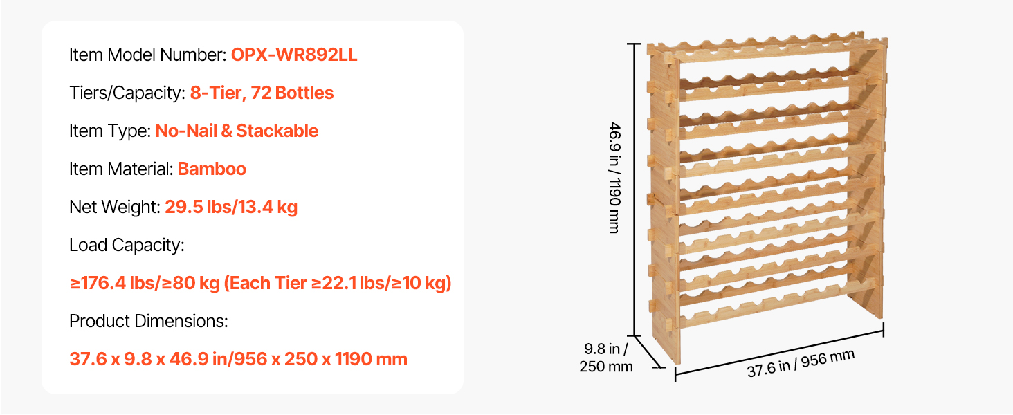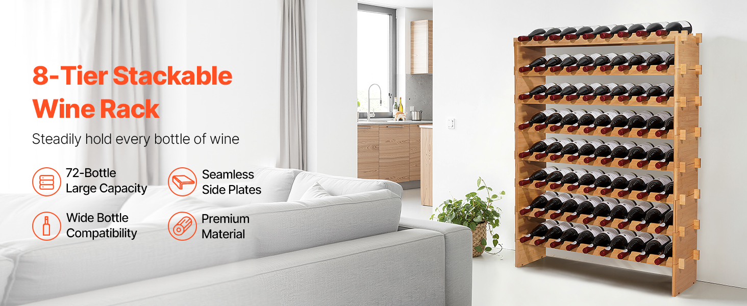 Tento voľne stojací modulárny stojan na víno má 8-vrstvovú konštrukciu, do ktorej sa pohodlne zmestí až 72 fliaš. Bezšvíkové bočné panely poskytujú pevnú oporu bez kolísania, zatiaľ čo rozšírené rozstupy sú vhodné pre fľaše Bordeaux, Pinot Noir a Champagne rôznych veľkostí.