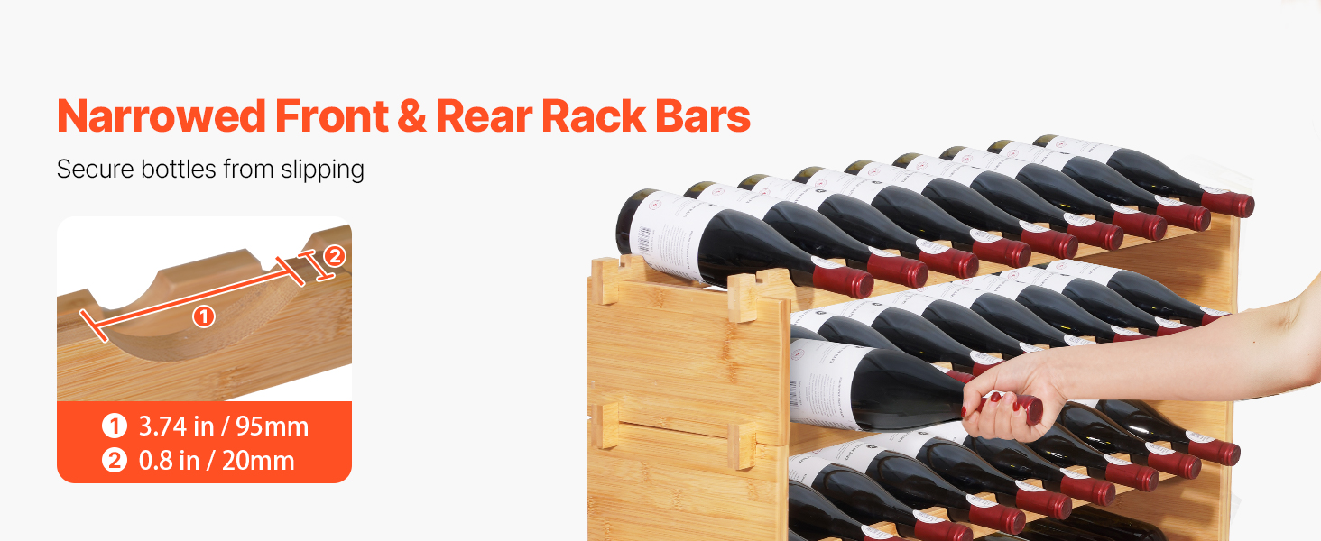 Vďaka hlbokým drážkam náš voľne stojací stojan na víno bezpečne drží fľaše a zabraňuje ich skĺznutiu. Mierne naklonenie dopredu a dozadu udržuje zátky vlhké a zabraňuje vniknutiu vzduchu, ktorý môže spôsobiť oxidáciu vína, čím pomáha víno udržať čerstvé po dlhší čas.