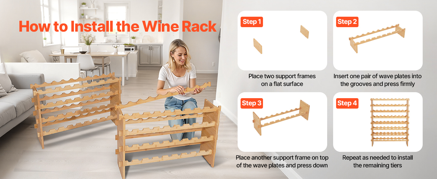 Náš regál do vínnej pivnice sa dodáva s podrobnými pokynmi na rýchlu montáž – nie sú potrebné žiadne ďalšie nástroje ani skrutky. Stačí zarovnať zárezy a drážky a stlačiť, aby sa regál zostavil. Inštaláciu zvládnu za pár minút aj začiatočníci.