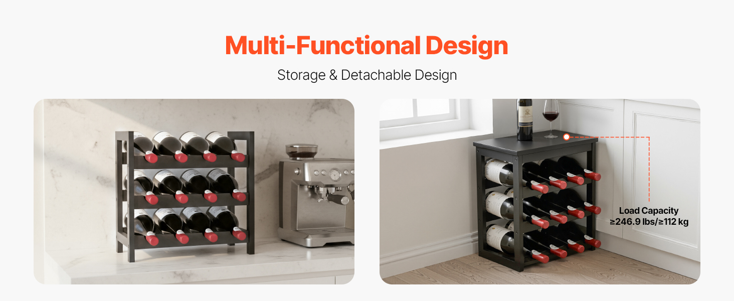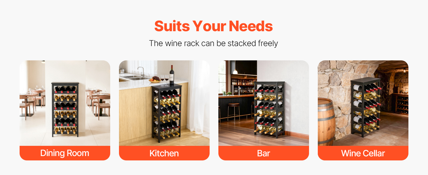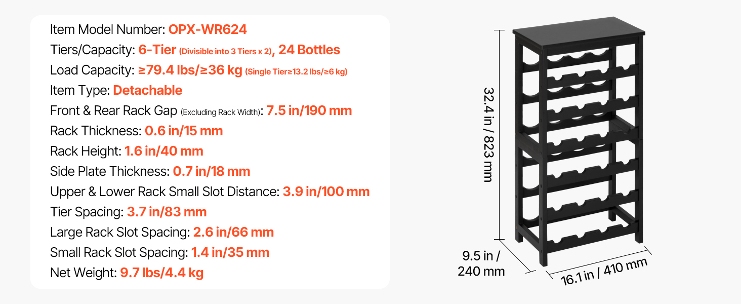 Tento 6-poschodový odnímateľný voľne stojací regál na víno pojme až 24 fliaš. Po rozložení sa poschodia dajú používať samostatne na pracovných doskách alebo v rohoch. Je kompatibilný s rôznymi typmi fliaš na víno, ako sú fľaše Bordeaux, Pinot Noir a Champagne.