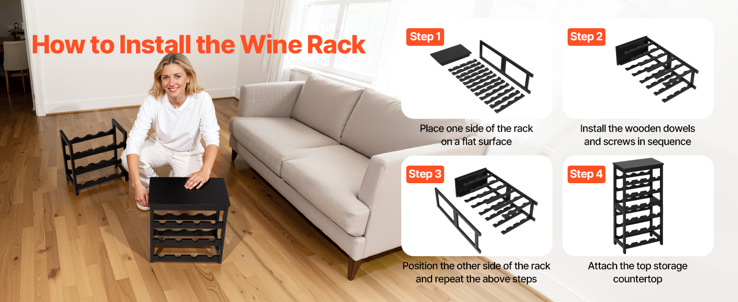 Naša polička na víno sa dodáva s podrobnými pokynmi na rýchlu montáž – nie sú potrebné žiadne ďalšie nástroje ani skrutky. Stačí zarovnať zárezy a drážky a stlačiť, aby sa polička zmontovala. Inštaláciu zvládnu za pár minút aj začiatočníci.