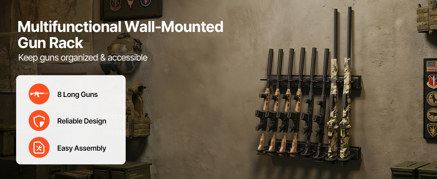 Tento nástenný držiak na zbrane pojme až 8 dlhých zbraní, čím zabezpečuje bezpečné uloženie a zároveň udržuje zbrane prehľadne usporiadané a ľahko dostupné.