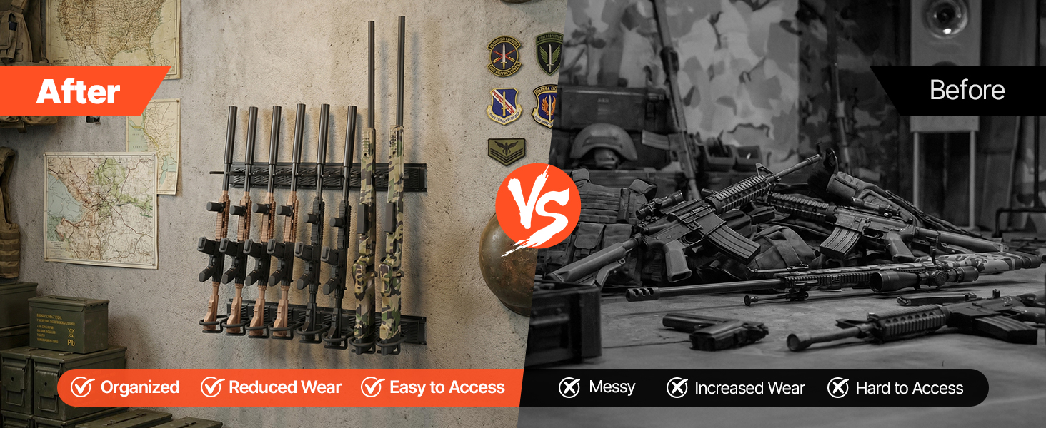 Rozlúčte sa s neporiadkom, ktorý môže spôsobiť opotrebenie a poškodenie vašich zbraní a sťažiť prístup k nim. Náš stojan na pušky udrží vaše zbrane a taktické vybavenie prehľadne usporiadané, bezpečne uložené a vždy po ruke.