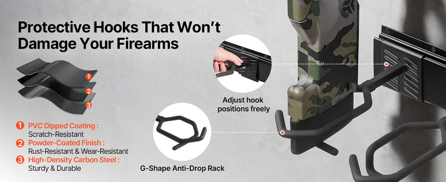 Vybavený práškovo lakovanými a PVC potiahnutými háčikmi v tvare G, držiak na pušky a brokovnice zabezpečuje strelné zbrane a zároveň minimalizuje škrabance a skĺznutie. Udržuje strelné zbrane vo vynikajúcom stave počas dlhodobého skladovania.