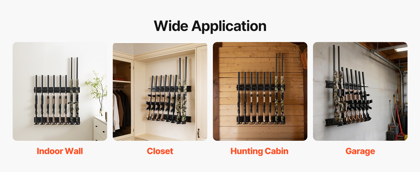 Tento nástenný stojan na pušky je vhodný na vnútorné steny, do garáží, poľovníckych chát a skríň. Udržuje zbrane usporiadané a ľahko dostupné v rôznych obytných a rekreačných priestoroch.