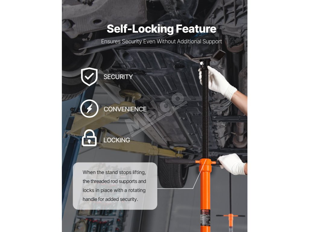 Uchopte gumovú rukoväť oboma rukami a otáčaním skrutkovacej tyče bezpečne zaistite výšku. Tento zdvihák je navrhnutý tak, aby poskytoval bezpečnosť a pohodlie tým, ktorí používajú podperné stojany pod vozidlom bez potreby pomoci iných osôb alebo dodatočného náradia.
