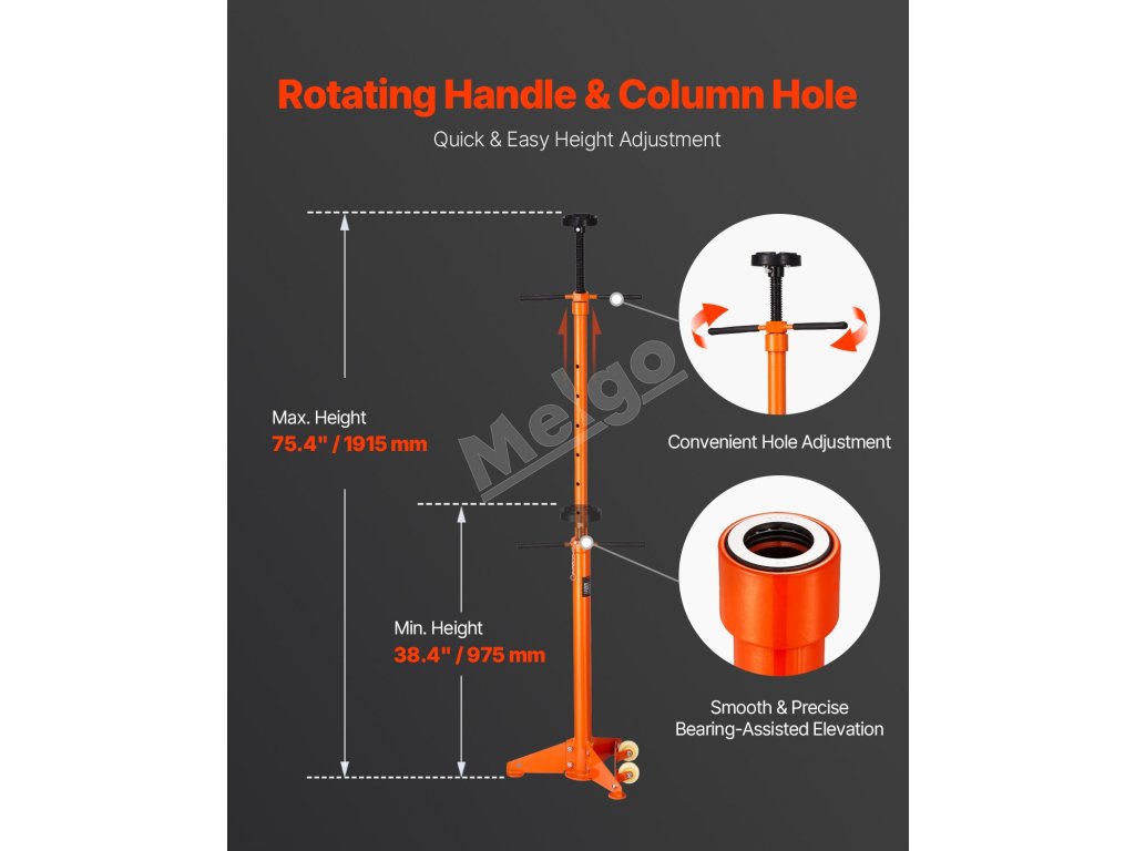 Stojan na zdvihák sa uzamkne do základnej výšky prostredníctvom otvorov a otočná rukoväť je vybavená axiálnymi ložiskami, čo umožňuje bezproblémové a rýchle nastavenie výšky aj pri veľkom zaťažení. Dosiahnite jednoduché a efektívne zdvíhanie a spúšťanie. Rozsah nastavenia výšky: 38.4" - 75.4".