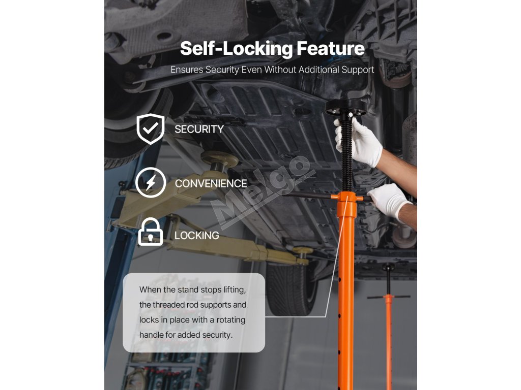 Uchopte gumovú rukoväť oboma rukami a otáčaním skrutkovacej tyče bezpečne zaistite výšku. Tento zdvihák je navrhnutý tak, aby poskytoval bezpečnosť a pohodlie tým, ktorí používajú podperné stojany pod vozidlom bez potreby pomoci iných osôb alebo dodatočného náradia.