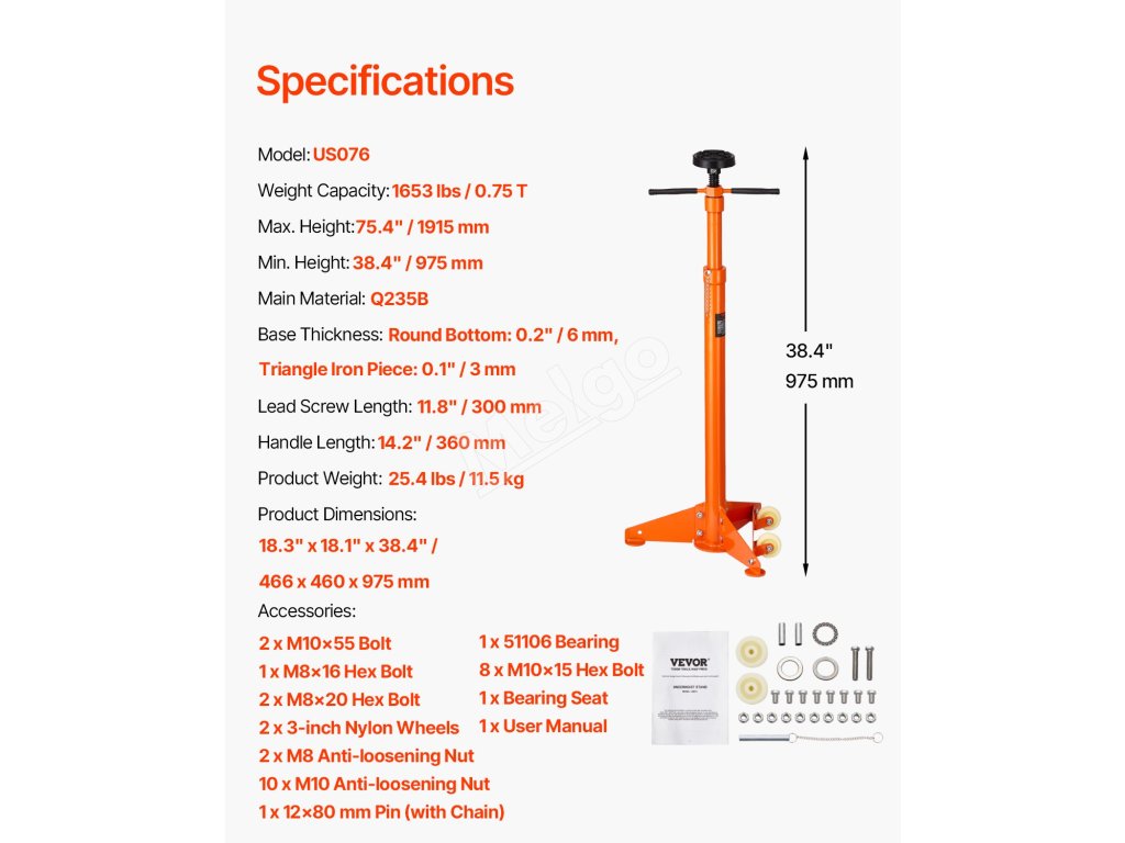 Stojan pod zvedák 3/4 ton zdvih 38.4–75.4 in samozam. závit 2 kolieska