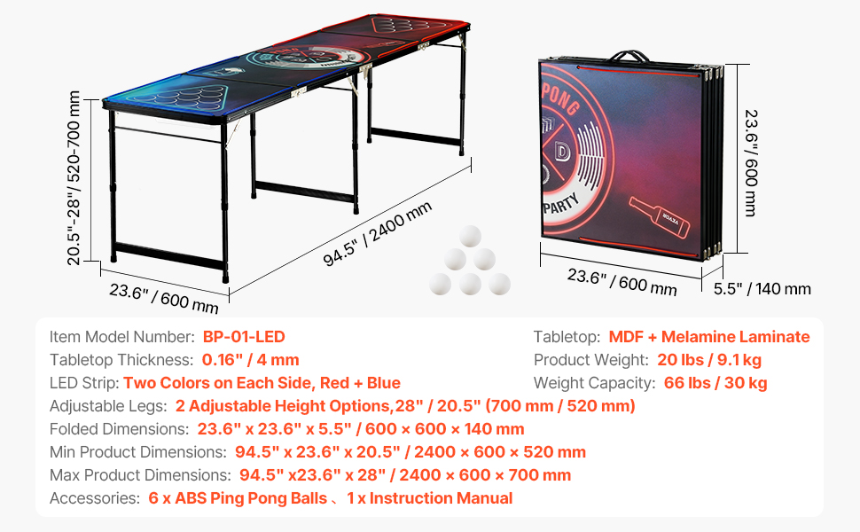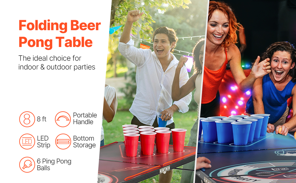 Tento 8 ft skladací pivný pingpongový stôl je vybavený pohodlnou rukoväťou na prenášanie, spodným úložným priestorom a dizajnom so svetelným LED pásom. Obsahuje aj 6 pingpongových loptičiek, takže je ideálnou voľbou na párty.