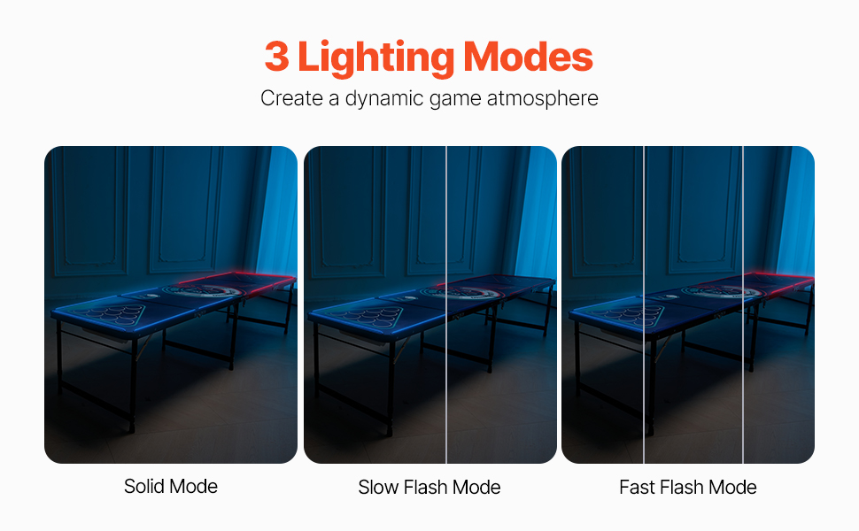 Tento skladací pivný pingpongový stôl je vybavený 3 režimami osvetlenia - stálym, pomalým blikaním a rýchlym blikaním, vďaka čomu môžete ľahko prepínať medzi hernými atmosférami, ktoré sa hodia na každú príležitosť.