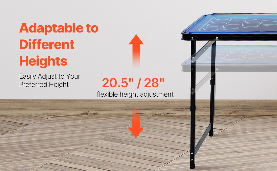 Tento kempingový stôl na beer pong má dve nastaviteľné výšky 20,5 palca a 28 palcov, vďaka čomu si ho hráči môžu flexibilne nastaviť podľa svojej výšky a preferencií, čo zaručuje pohodlné a individuálne hranie pre každého.
