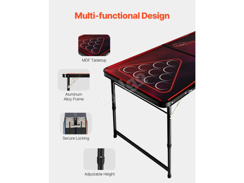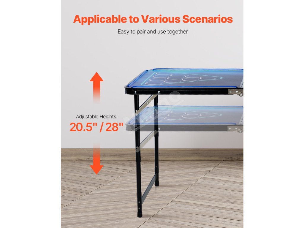 Tento kempingový stôl na beer pong má dve nastaviteľné výšky 20,5 palca a 28 palcov, vďaka čomu si ho hráči môžu flexibilne nastaviť podľa svojej výšky a preferencií, čo zaručuje pohodlné a individuálne hranie pre každého.