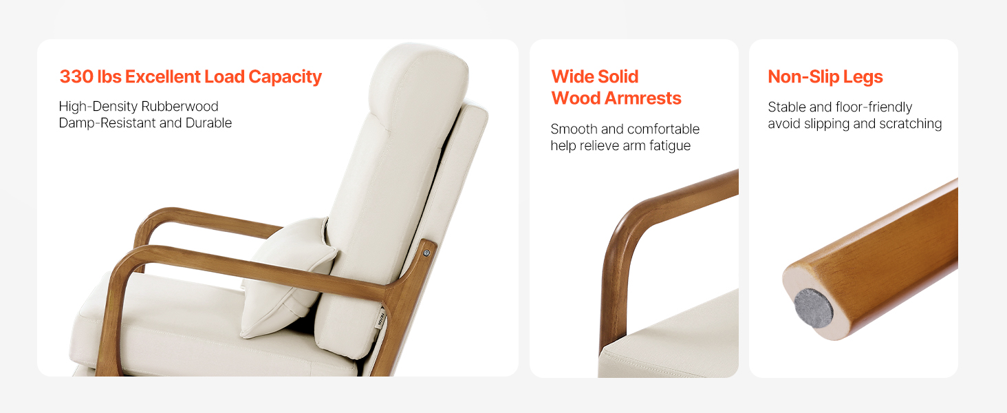 Toto akcentové kreslo je vyrobené zo zahusteného masívneho dreva a unesie až 150 kg. Hladký povrch je bez otrepov a ergonomické podrúčky poskytujú oporu pre ruky pri práci alebo relaxácii. Podložky pod nohy zaisťujú stabilitu a pomáhajú zabrániť poškodeniu podlahy.