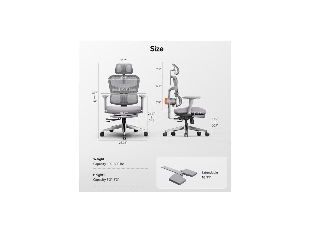 Nastavenie pevnosti spodnej časti chrbta: Áno Nastavenie sily spodnej opierky chrbta 5 polôh na uzamknutie: Áno Nastavenie opierky hlavy: Výška 13 cm, uhol 30 stupňov Nastavenie sklonu: 96 stupňov/106 stupňov/116 stupňov/126 stupňov Nezávislé nastavenie výšky opierky chrbta: 5 cm Materiál opierky chrbta: Kórejská sieťovina Filo na chrbte Výplň zo špongiového vankúša: Poťahová látka sedadla: Áno Potahová látka sedadla: Odolný voči vode, antistatický Nastavenie opierky rúk:: 4D: Výška 8 cm, 4 cm dozadu dopredu, 2 cm dovnútra von, 20-stupňové otočenie dookola Opierka nôh: Áno Základňa: Maximálna výška nastavenia stoličky: Hliníková zliatina Max: Maximálna hmotnosť: 350 libier Hydraulický plynový zdvih: Trieda 4 |