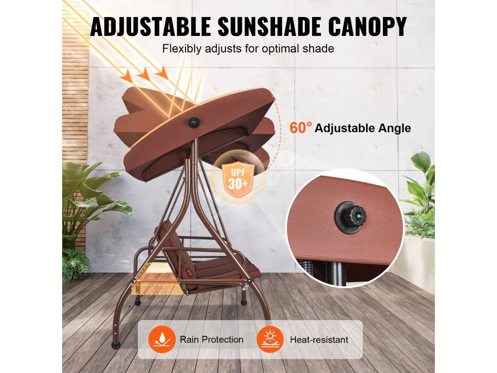 Vrchnú striešku slnečníka možno nastaviť pomocou gombíka až do uhla 60°, čím sa dosiahne optimálny efekt slnečného tieňa. Vonkajšie hojdačky pre dospelých sú vyrobené z polyesterovej tkaniny, ktorá odoláva vyblednutiu aj pri vonkajšom vystavení.