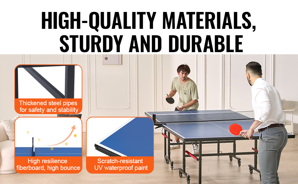 Tento pingpongový stôl je vyrobený z odolnej MDF dosky, viacvrstvový povrch s UV farbou, poskytuje konzistentný a spoľahlivý odskok loptičky, čo vám umožní podávať najlepšie výkony.
