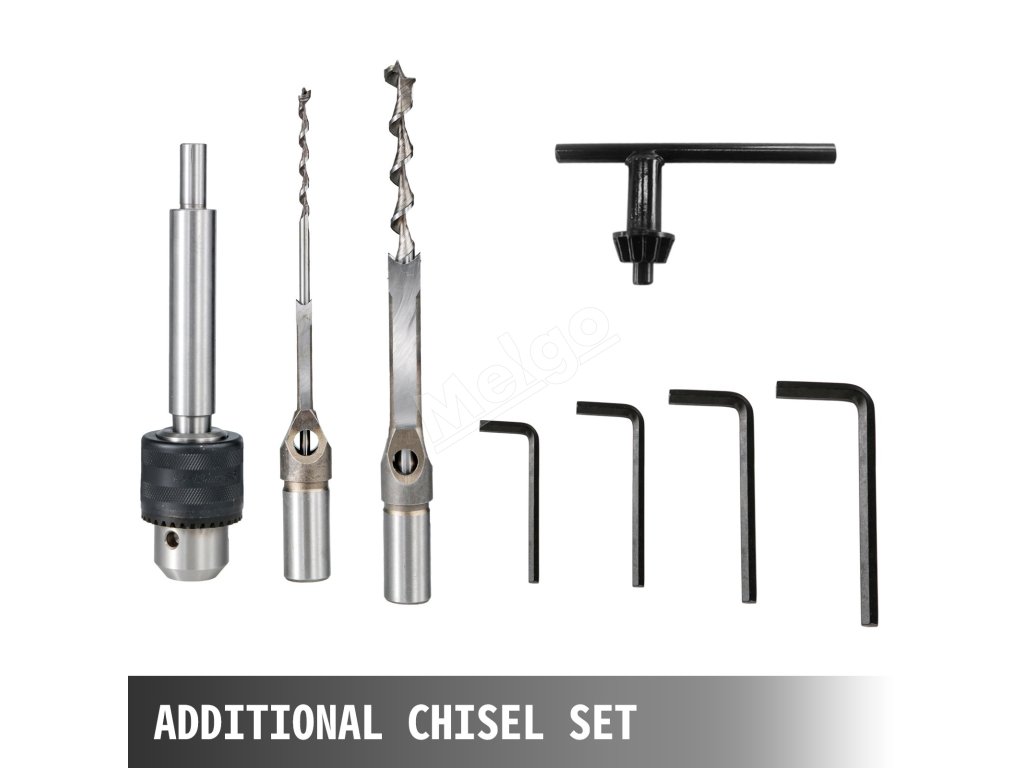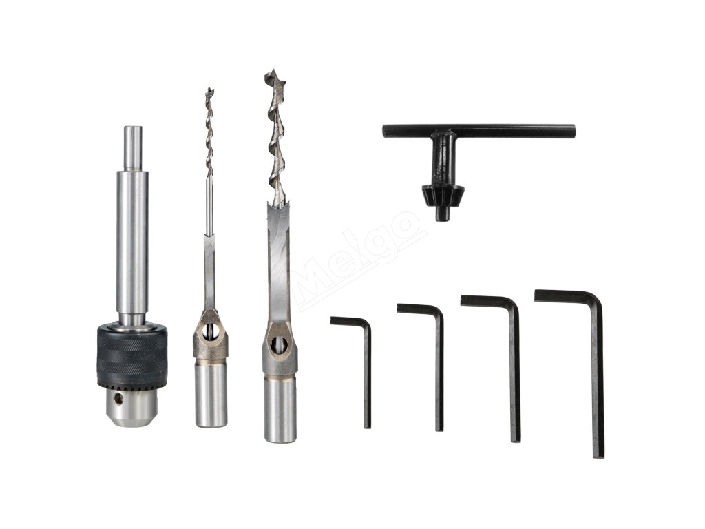 Tento hĺbkotlačový stroj na obrábanie dreva obsahuje 13 mm skľučovadlo so stabilným vrtákom, 3/8 čap, držiak dlát, kľúč na inštaláciu vŕtacieho upínača a štyri šesťhranné kľúče.