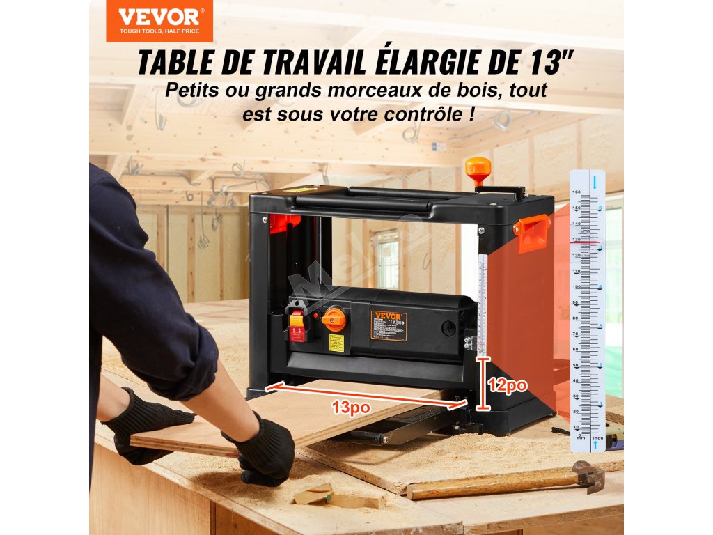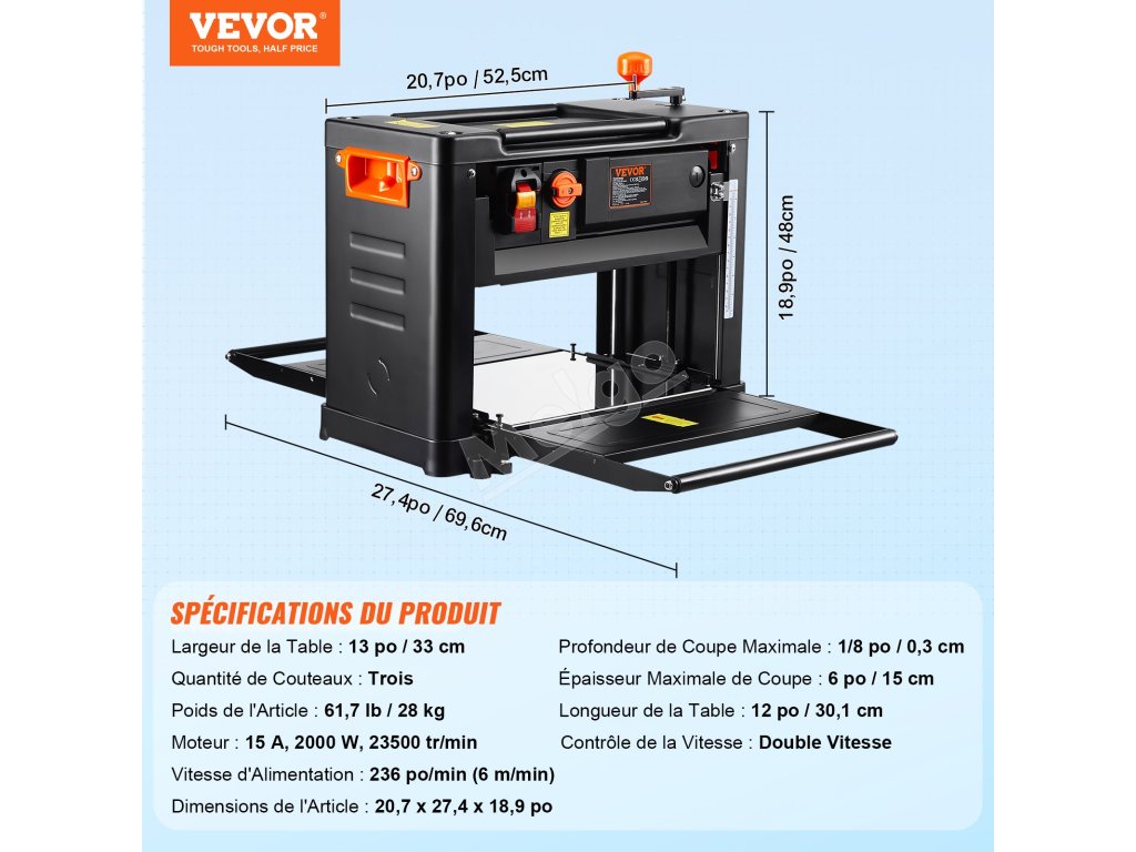 Už vás nebaví pozorovať nerovný povrch alebo rezy na vašich kusoch dreva? Vyskúšajte si VEVOR 13 v trojnožovom, dvojrýchlostnom hrúbkovom hoblíku je poháňaný 15 A motorom s 23500 otáčkami za minútu a rýchlosťou posuvu 236 v/min, ktorý poskytuje optimálny výkon hoblíka.