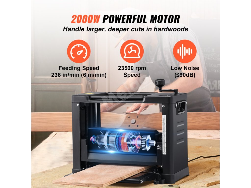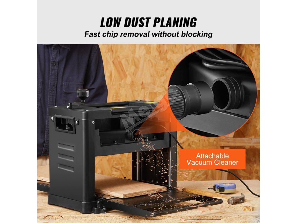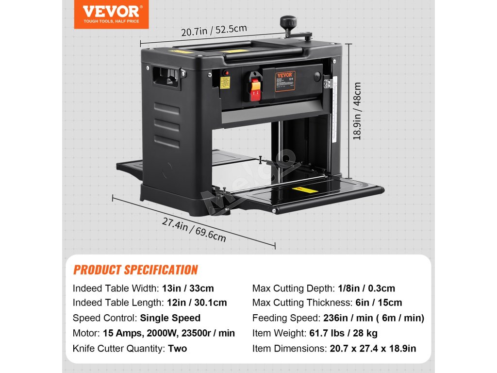 Už vás nebaví pozorovať nerovný povrch alebo rezy na vašich kusoch dreva? Vyskúšajte si hoblík VEVOR s hrúbkou 13 palcov, poháňaný 15A 1800W motorom s 23500 otáčkami za minútu a rýchlosťou posuvu 236 v/min, ktorý poskytuje optimálny výkon pre plošné hobľovanie.