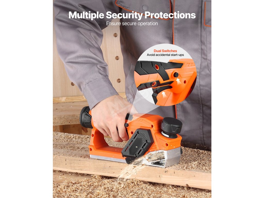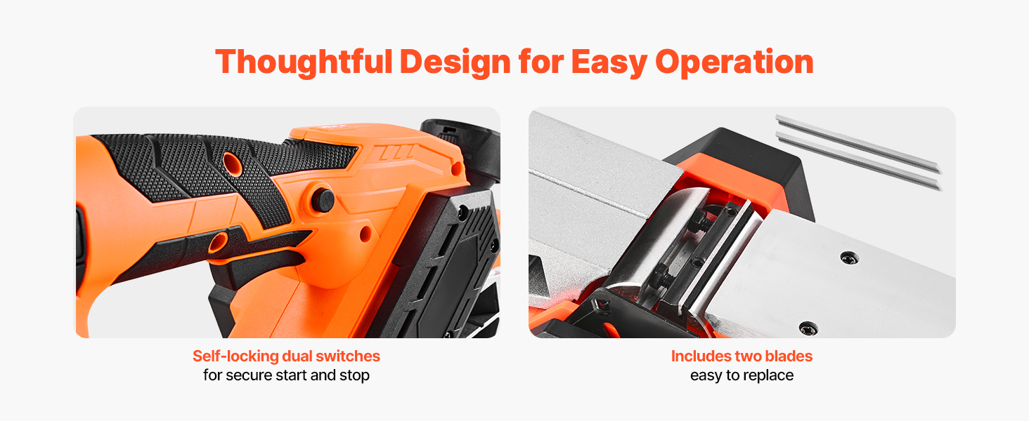 Tento elektrický hoblík na drevo je vybavený dvoma samočinnými spínačmi na bezpečné spustenie a zastavenie. Jeho súčasťou sú aj dva nože na jednoduchú výmenu, vďaka čomu je táto operácia rýchlejšia a pohodlnejšia.