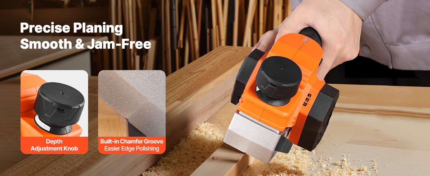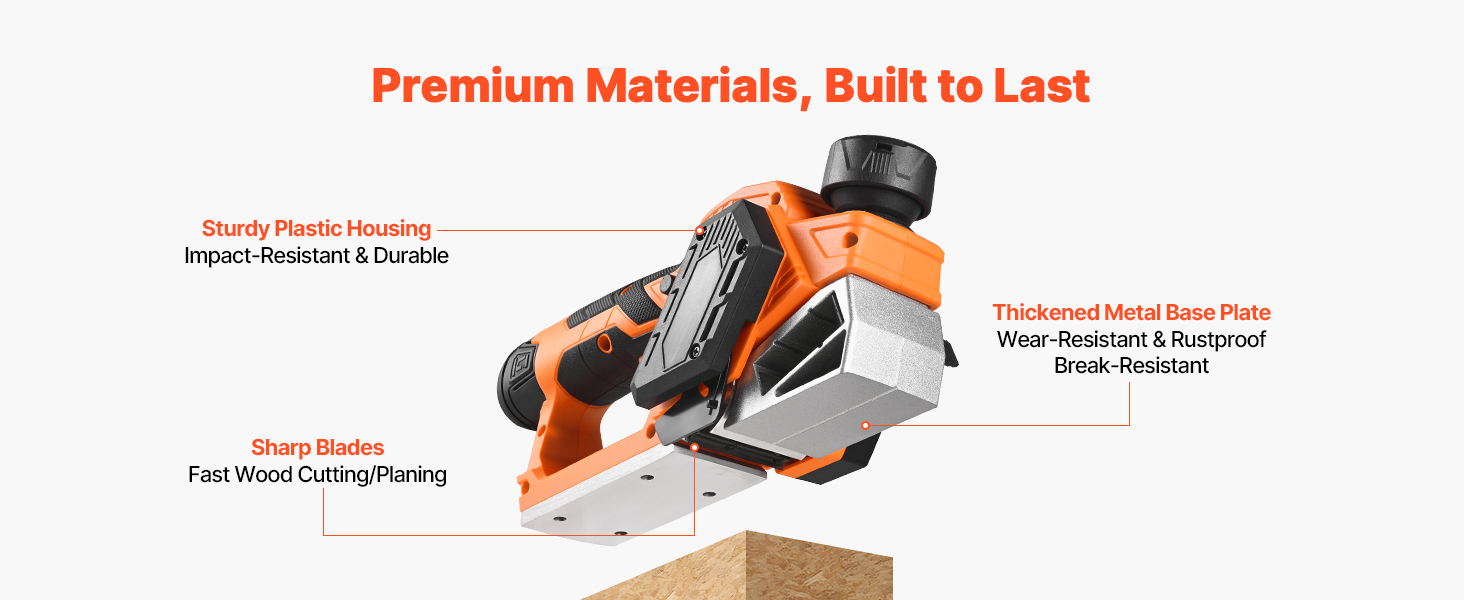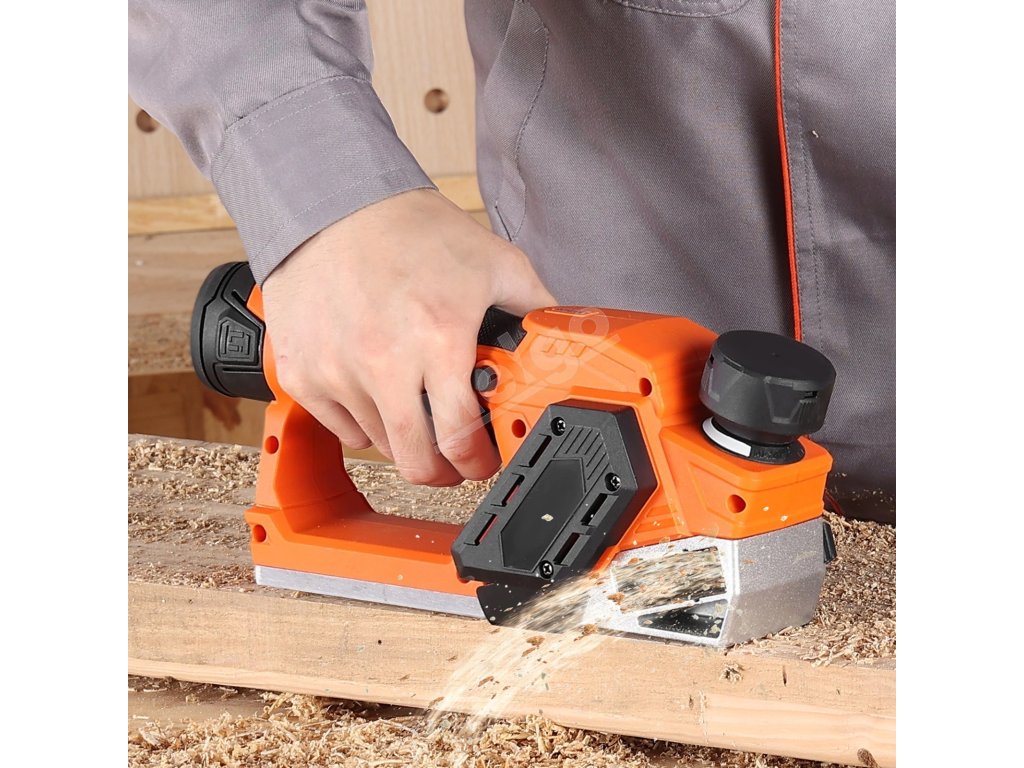 Vďaka výkonnému motoru poskytuje náš elektrický ručný hoblík silný výkon. Robustný plastový kryt je odolný voči nárazom, zatiaľ čo zosilnená kovová základná doska odoláva opotrebovaniu a hrdzi. Ostré nože poskytujú rýchle rezanie a hladké hobľovanie, čím predlžujú životnosť.