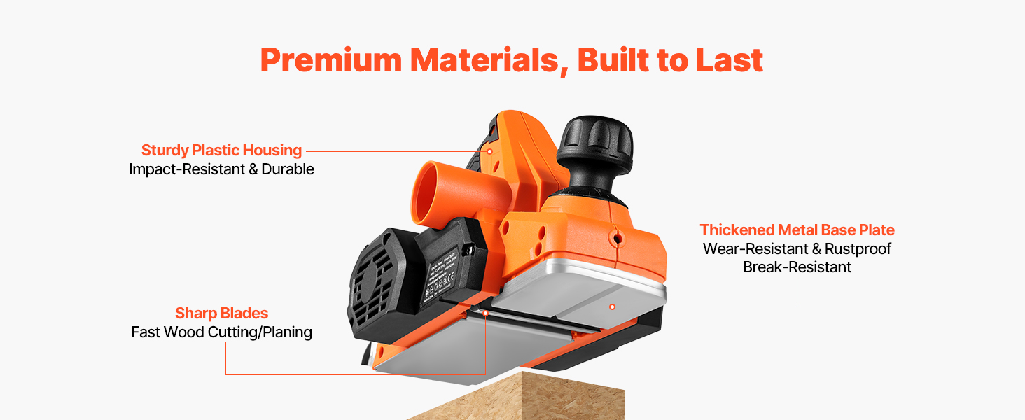 Vďaka výkonnému motoru poskytuje náš elektrický ručný hoblík so šnúrou silný výkon. Robustný plastový kryt je odolný voči nárazom, zatiaľ čo zosilnená kovová základná doska odoláva opotrebovaniu a hrdzi. Ostré nože poskytujú rýchle rezanie a hladké hobľovanie, čím predlžujú životnosť.