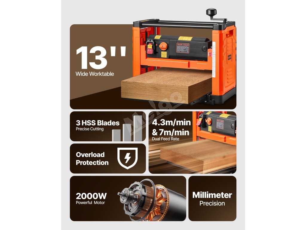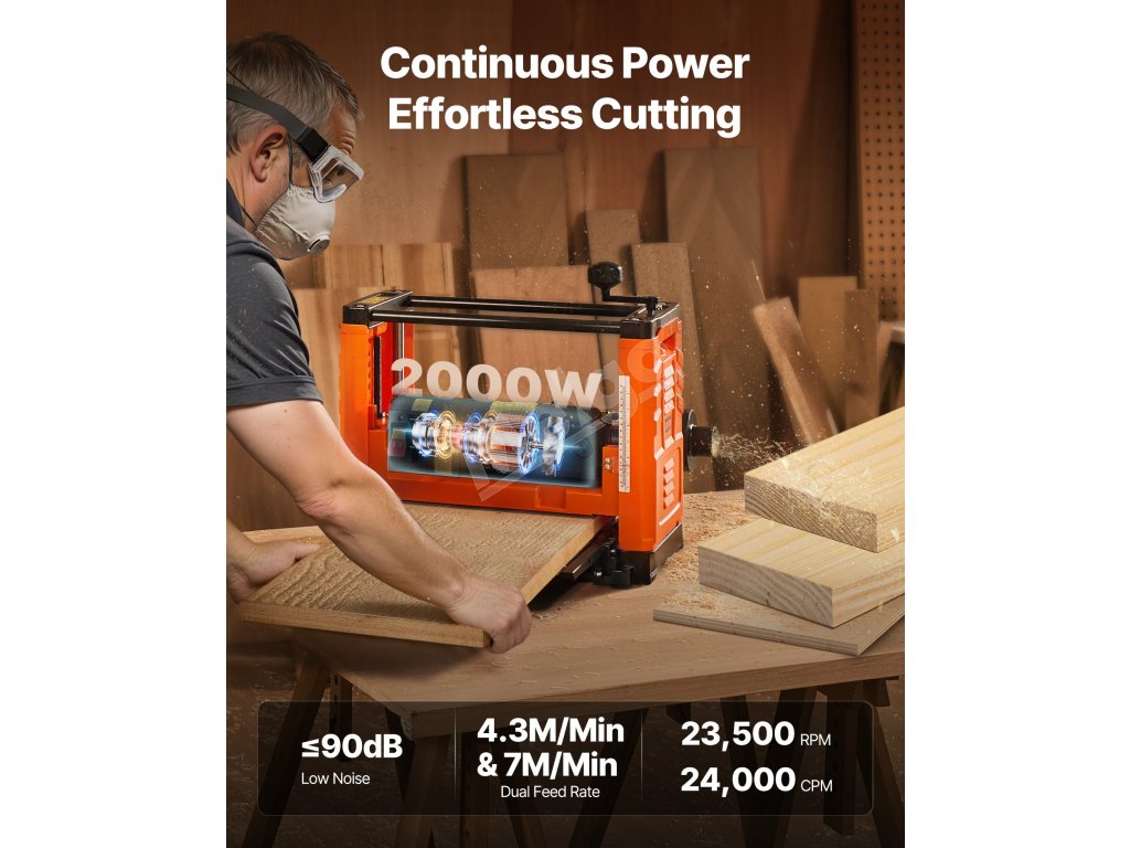 Hrúbkovací hoblík 330 mm stôl, 2000 W, 23500 RPM, 3 nože, 2 rýchlosti