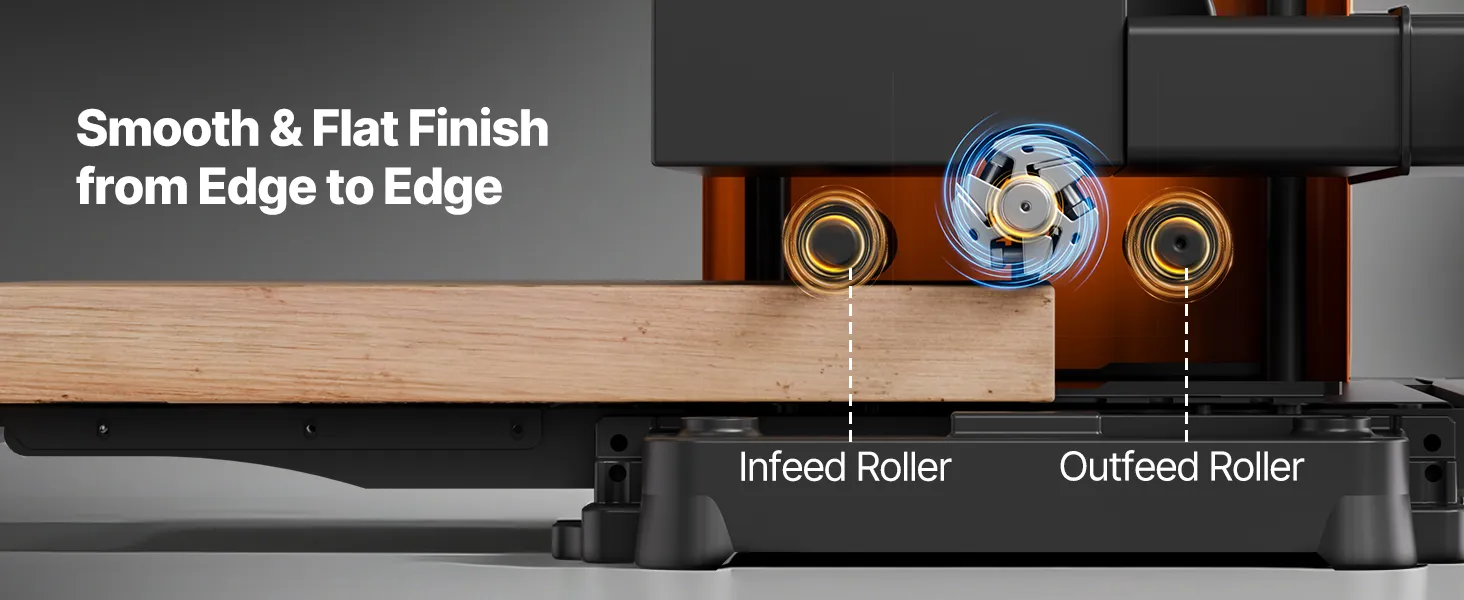 Odpoveď: Hoblík je vybavený dvojitými valcami na vstupných/výstupných otvoroch na stabilné podávanie. Zabezpečuje, aby bol pracovný stôl počas používania vodorovný, alebo pred/za projektové dosky pridajte obetné odrezky.