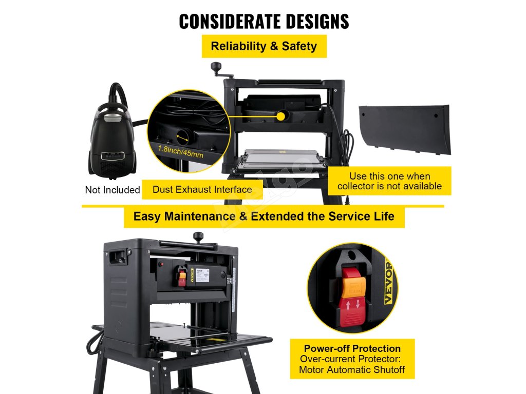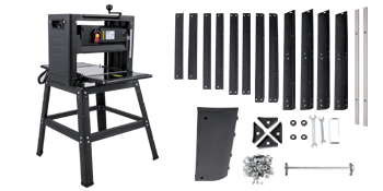 Pre vaše pohodlie vám poskytujeme odnímateľný stojan pre odolnosť a dlhú životnosť. V dôsledku toho môžete náš stojan použiť ako náhradu pracovného stola. Okrem toho štyri gumové nožičky zabraňujú kolísaniu hoblíka počas prevádzky. Taktiež môžete sklopiť rozširujúce dosky na jednoduché uskladnenie.