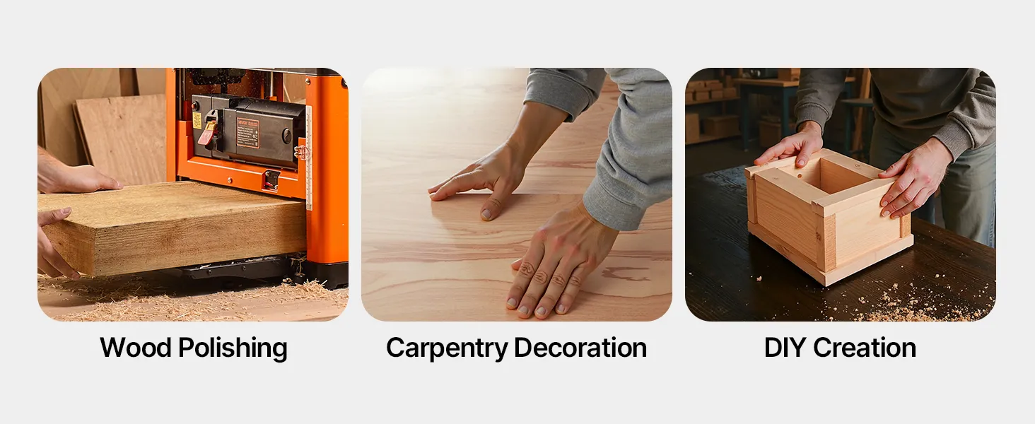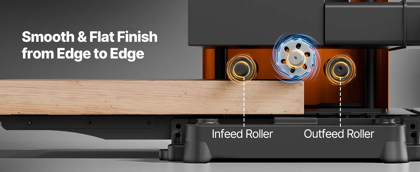 Odpoveď: Hoblík je vybavený dvojitými valcami na vstupných/výstupných otvoroch na stabilné podávanie. Zabezpečuje, aby bol pracovný stôl počas používania vodorovný, alebo pred/za projektové dosky pridajte obetné odrezky.