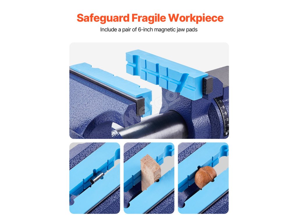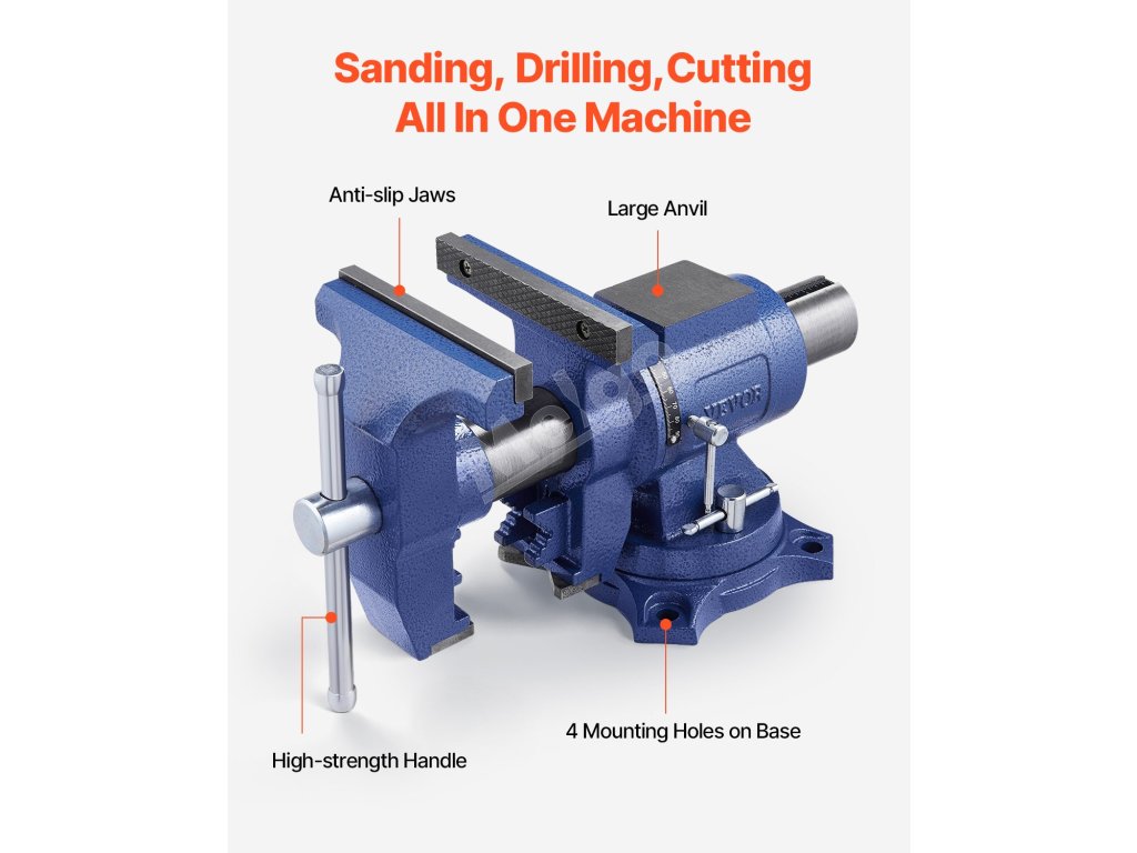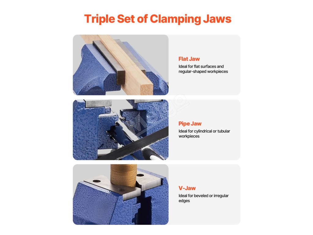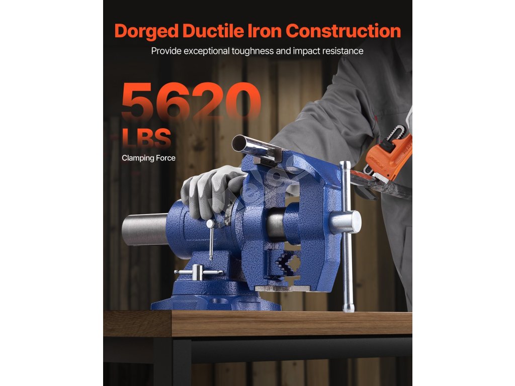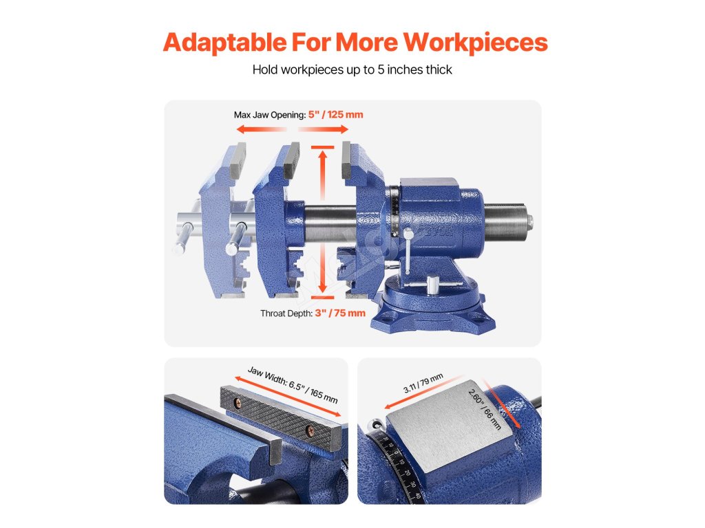 Náš stolový zverák, vyrobený z kvalitnej tvárnej liatiny, s 360° otočnou hlavou a základňou, vám umožní pracovať z akéhokoľvek uhla. 6.šírka čeľustí 5", otvorenie čeľustí 5" a kovadlina s rozmermi 3,11" x 2,60" na manipuláciu s väčšími obrobkami. Získajte bezpečný úchop okrúhlych rúrok a nepravidelných tvarov pomocou čeľustí na rúrky a V-čeľustí.