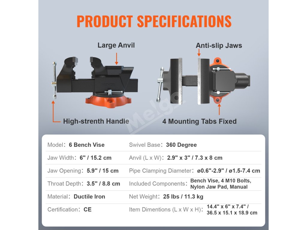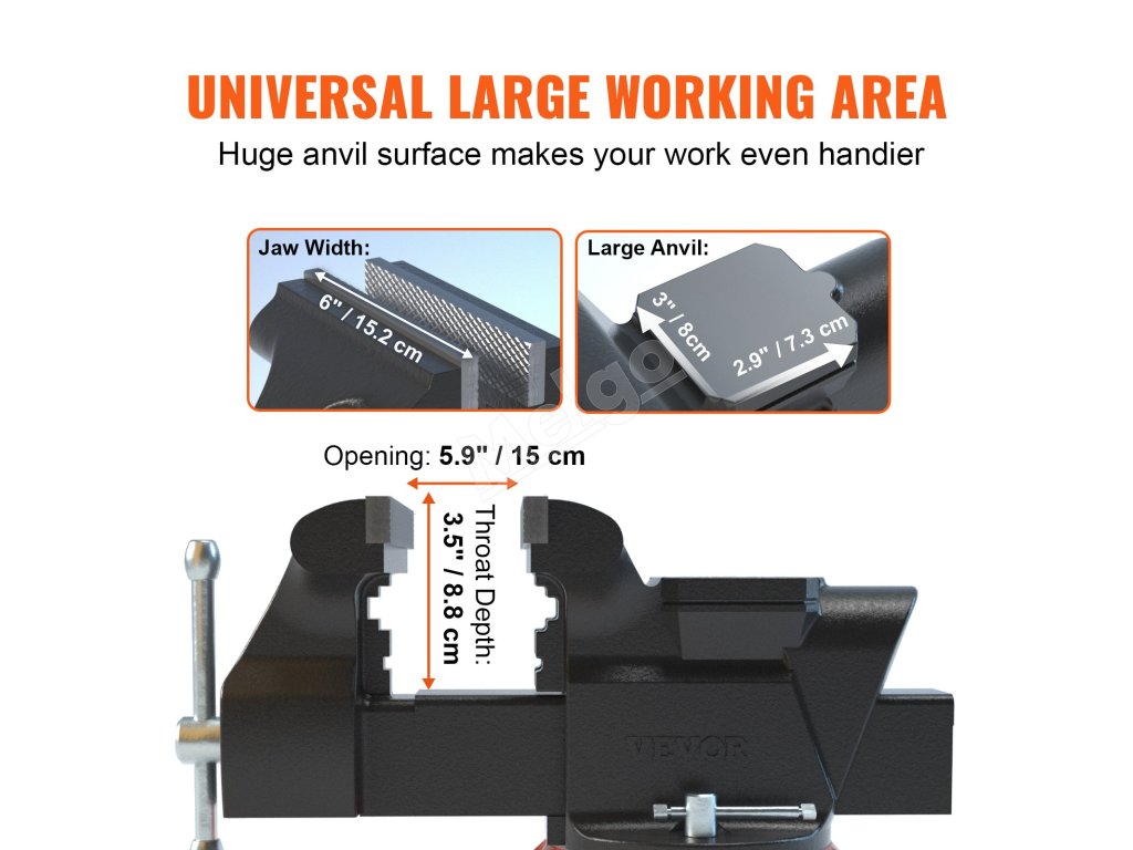 Stolový zverák VEVOR s priemerom 6 palcov má veľkú plochu kovadliny. Vďaka tomu je všestrannejšie na vykonávanie viacerých úloh. Kovadlina má rozmery 2,9 × 3 palce. Veľká plocha kovadliny je ideálna na rôzne projekty. Môžete tak ľahko vykonávať viacero úloh. Odolná a spoľahlivá: Kovadlina poskytuje presnú a precíznu prácu. Široká kovadlina: Veľká kovadlina dodáva zveráku funkčnosť. Je to teda neuveriteľne všestranný nástroj pre potreby vašej dielne.