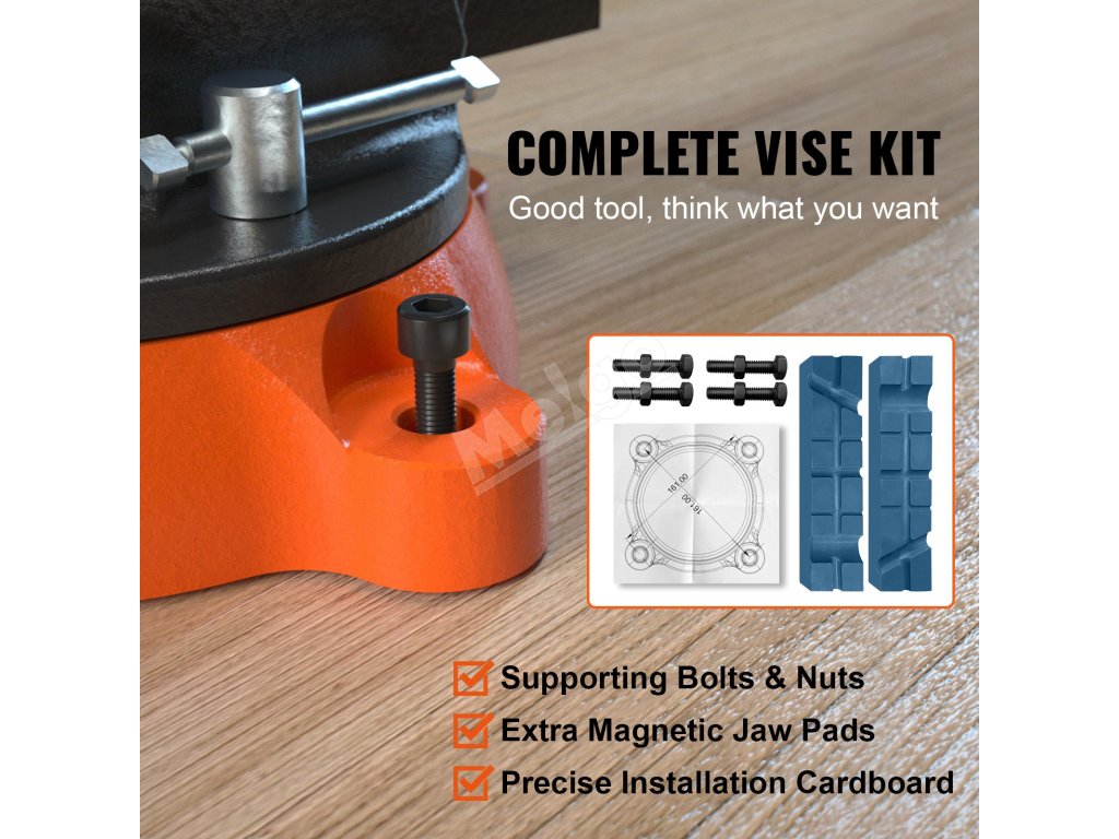 Súčasťou tohto zveráka je aj premyslená súprava príslušenstva. Obsahuje matice, skrutky, návod a magnetické podložky pod čeľuste. Vďaka tomu je inštalácia jednoduchá a bezproblémová. Nie je potrebné dokupovať ďalšie príslušenstvo. Magnetické podložky čeľustí chránia chúlostivé povrchy. Zabezpečujú pevné uchytenie bez poškodenia obrobkov a zároveň udržiavajú priľnavosť k obrobku alebo iným materiálom počas montáže. Zverák sa dá jednoducho namontovať na pracovný stôl. Nastavenie je rýchle a jednoduché. Súprava príslušenstva zvyšuje pohodlie a hodnotu. Vďaka nej je proces inštalácie hladký a efektívny.