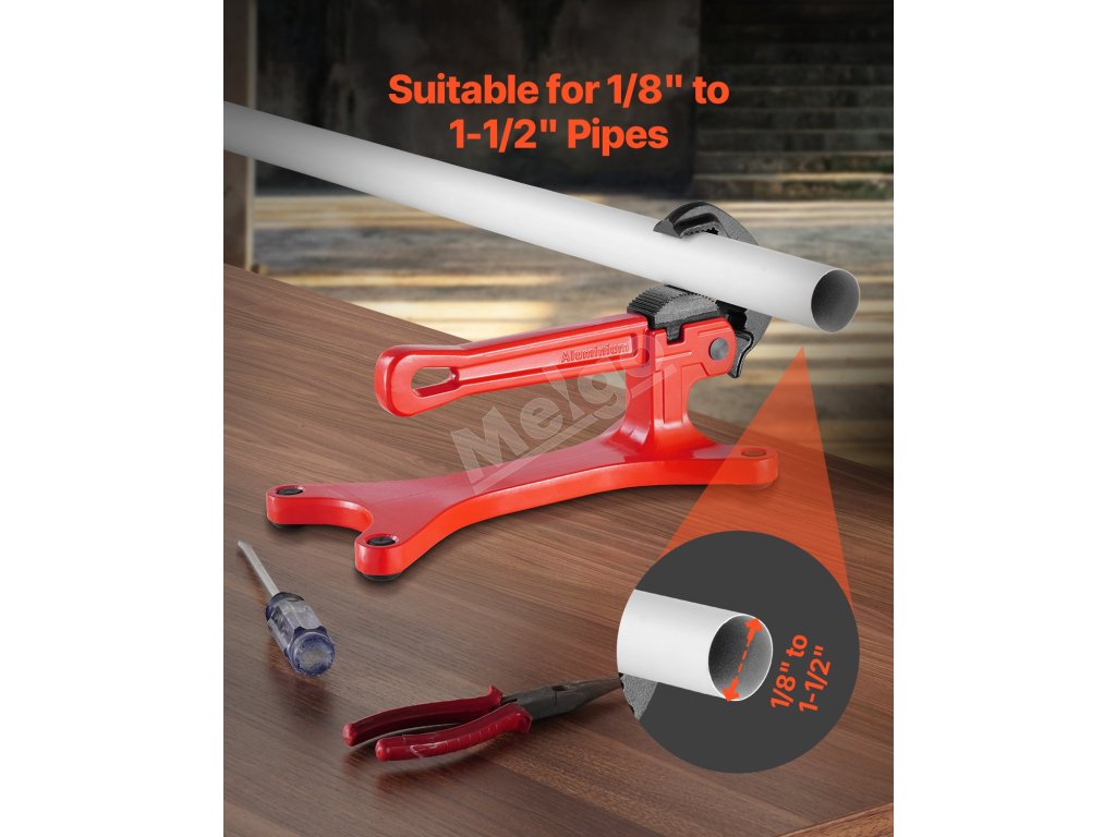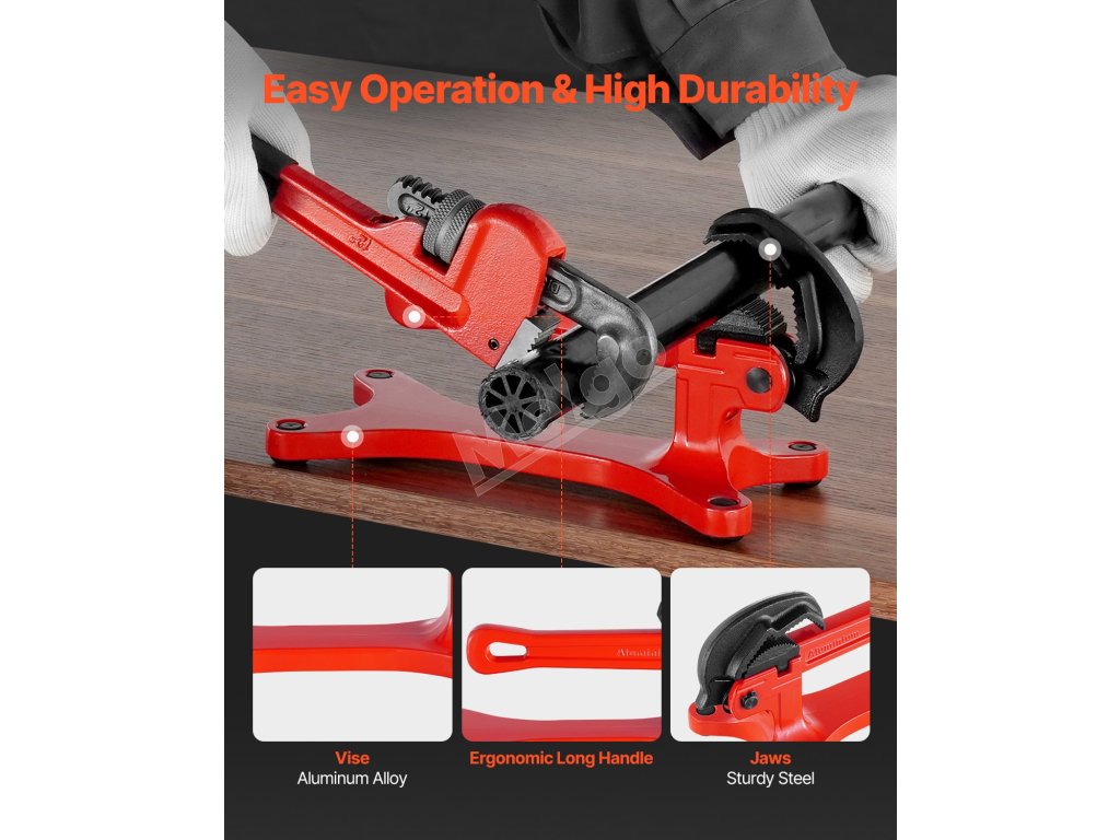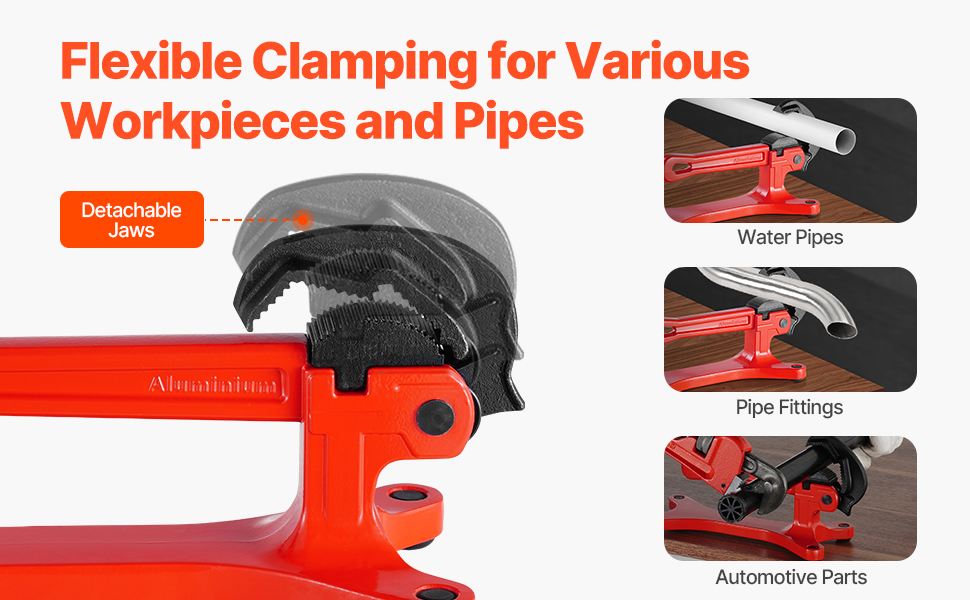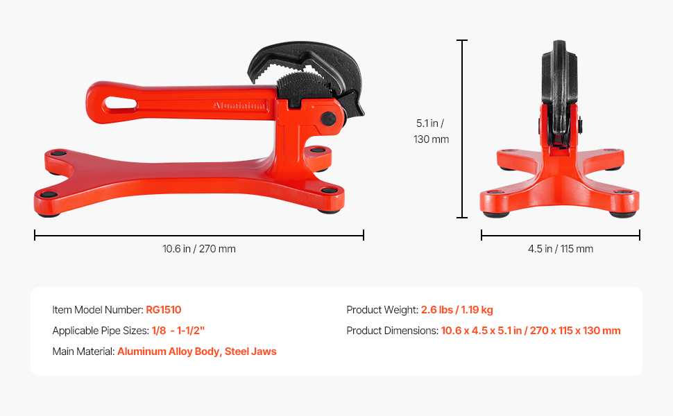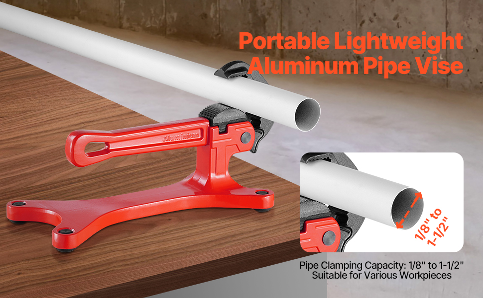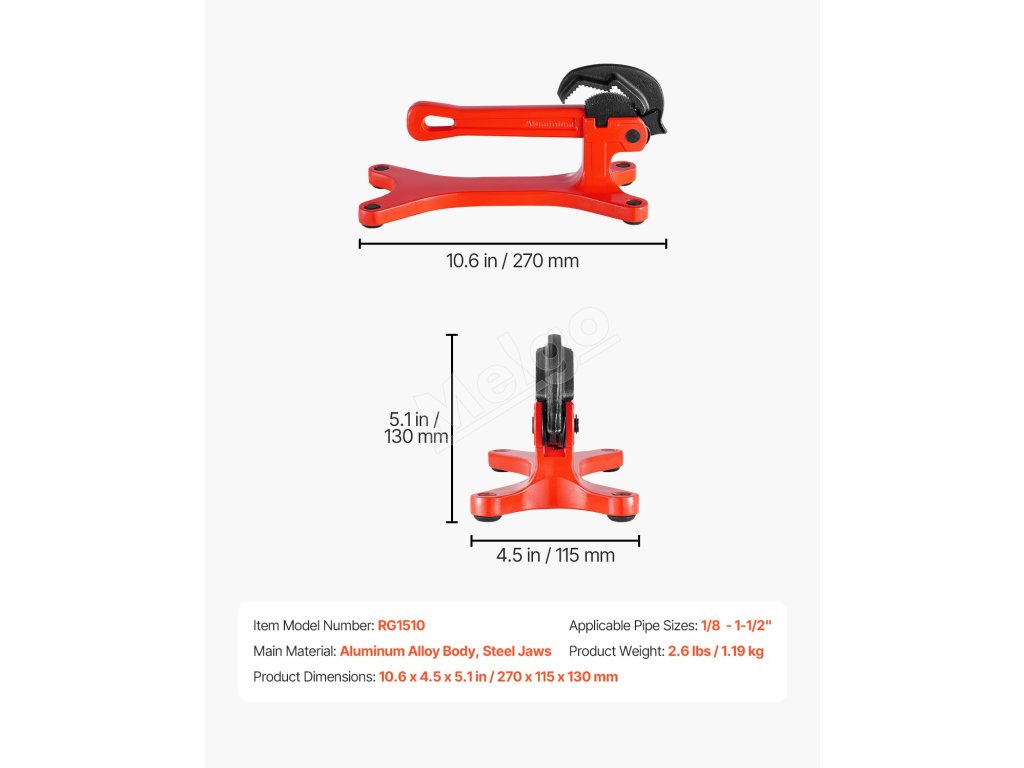 Tento zverák na rúry je vhodný pre širokú škálu rúr od 1/8 palca do 1-1/2 palca a poskytuje stabilné a spoľahlivé upínanie. Je vyrobený z vysokokvalitnej hliníkovej zliatiny a čeľustí z tvrdenej ocele, je odolný, ľahký a zároveň sa ľahko prenáša, takže je vhodný na rôzne pracoviská.