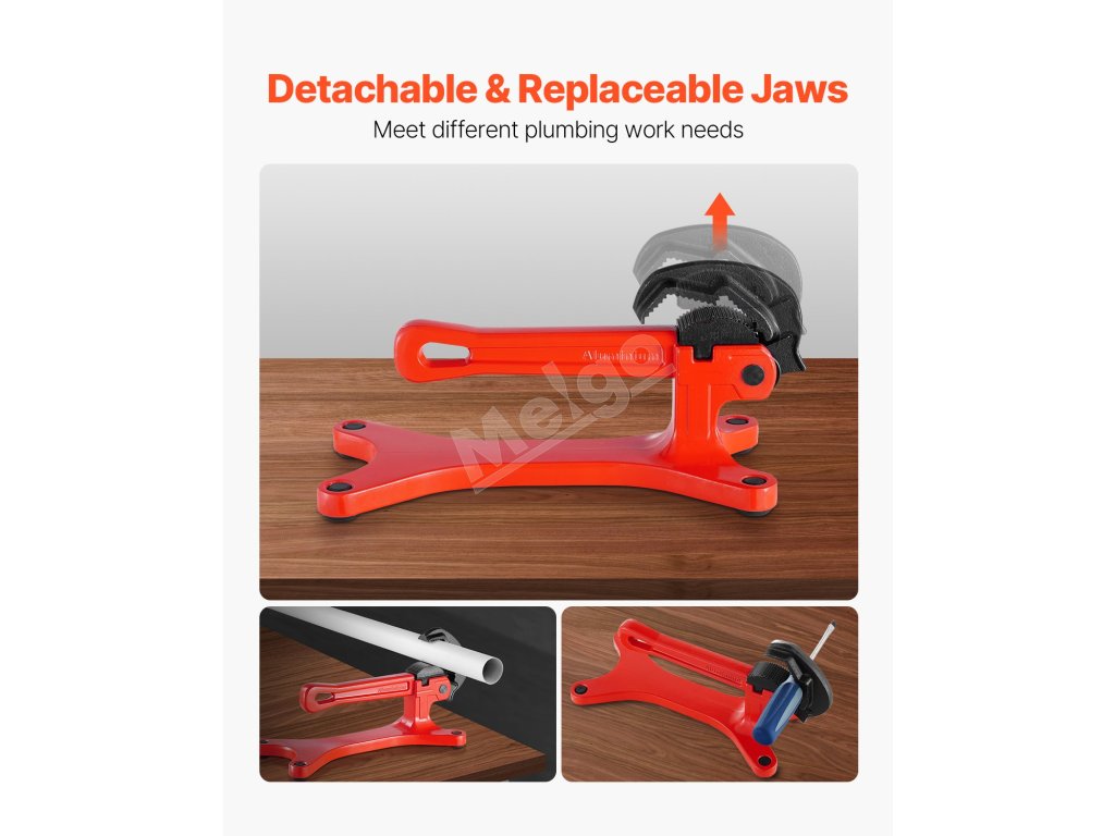 Čeľuste sú odnímateľné, čo umožňuje tomuto zveráku na rúry flexibilne prispôsobiť obrobky a rúry rôznych veľkostí. (Náhradné čeľuste NIE sú súčasťou dodávky)