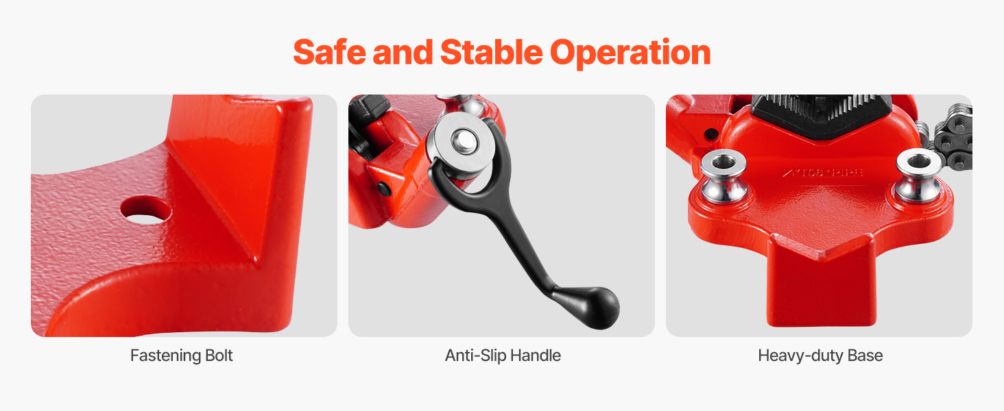 Náš reťazový zverák na rúry je vybavený protišmykovými čeľusťami v tvare písmena V a odolnou reťazou, ktorá poskytuje stabilné a bezpečné upnutie na ochranu rúr pred poškodením počas spracovania.