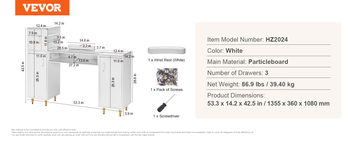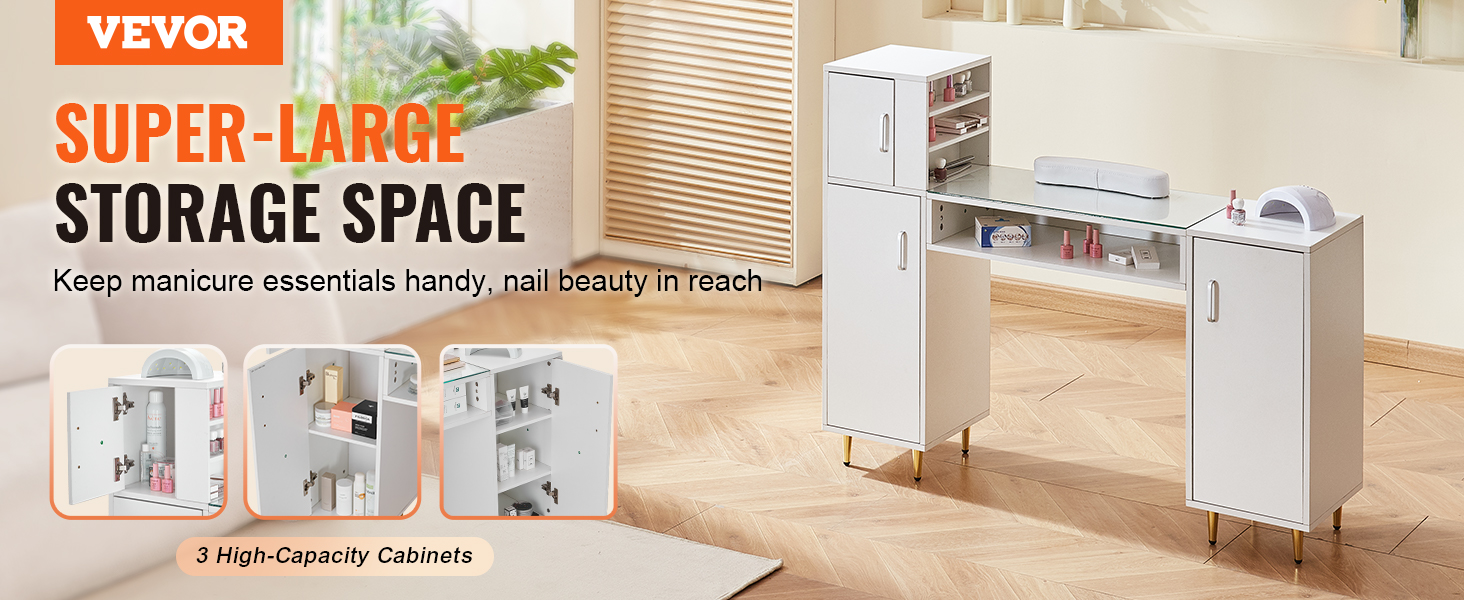 Pozdvihnite svoj zážitok z manikúry s manikúrovým stolíkom VEVOR, ktorý je navrhnutý tak, aby štýlovo a pohodlne spĺňal vaše požiadavky na úpravu nechtov. Vďaka dostatočnému úložnému priestoru, vysokokvalitným materiálom a robustnej konštrukcii zaručuje uprataný pracovný priestor a odolnosť, čo je dobrá voľba pre salóny alebo osobné použitie doma.