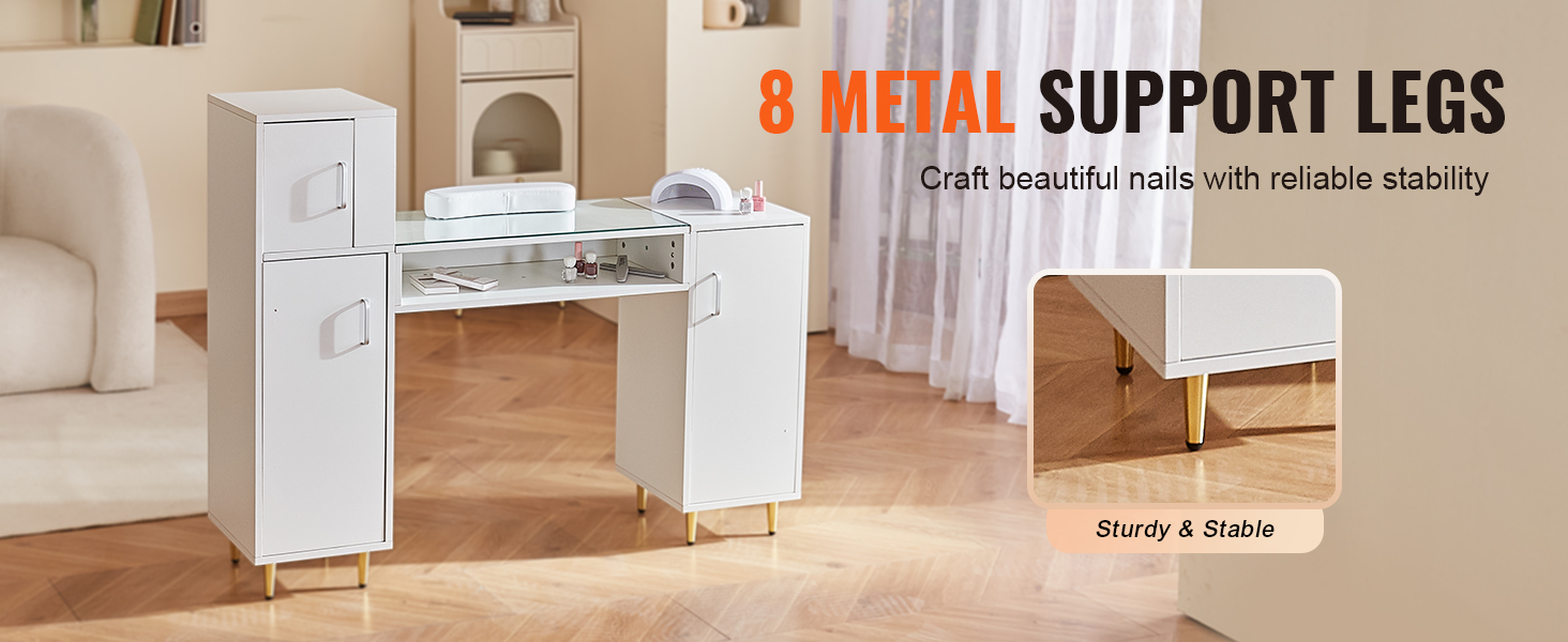 Vytváranie úžasných nechtových vzorov si vyžaduje stabilný základ. Táto stolová stanica na nechty v salóne Spa je vybavená 8 odolnými kovovými nohami, ktoré poskytujú výnimočnú oporu a stabilitu. Jej robustná konštrukcia zabezpečuje minimálne otrasy alebo zrútenie, čím pozdvihuje pôvab každej tvorby nechtov.